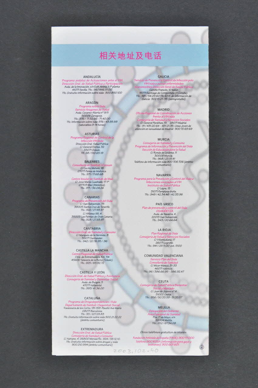 MINISTERIO // DE SANIDAD // Y CONSUMO // // DIRECCION GENERAL DE // SALUD PÚBLICA // Y CONSUMO // // SECRETARIA DEL PLAN // NACIONAL SOBRE EL SIDA (Imprimé en couleurs dans l'angle inférieur gauche), rectoDécor
