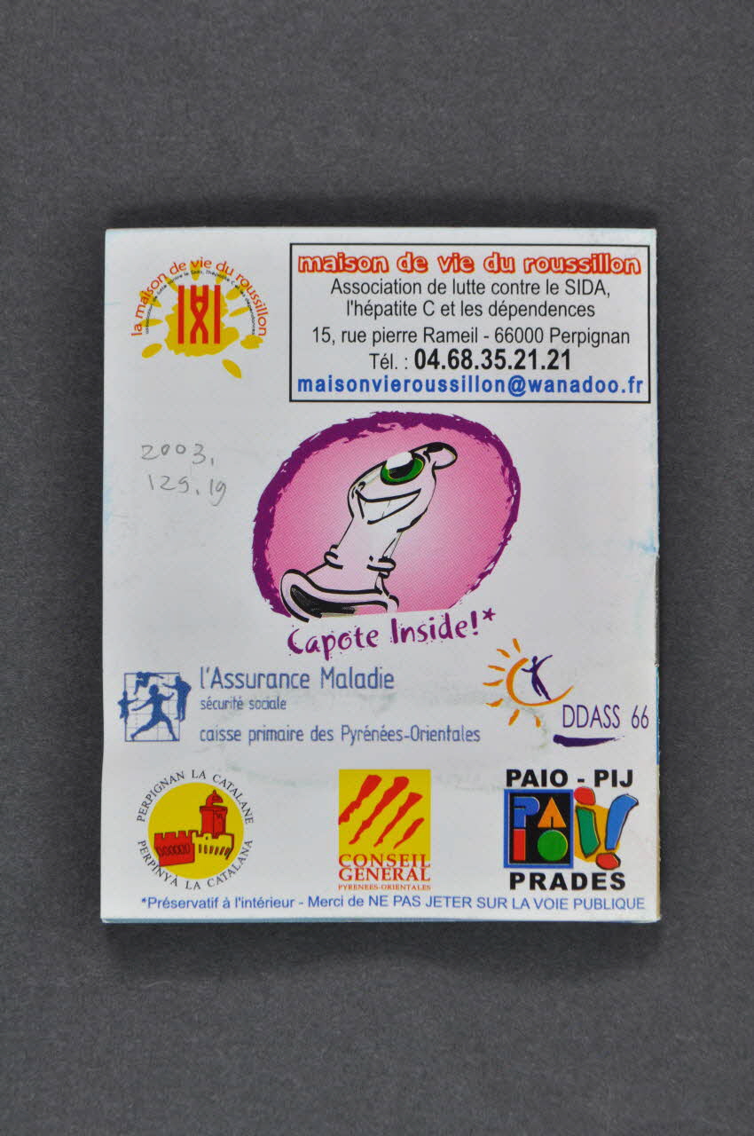 maison de la vie du roussillon // Association de lutte contre le SIDA, l'hépatite C et les dépendences // 15, rue pierre Rameil - 66000 Perpignan // Tél.: 04.68.35.21.21 // maisonvieroussillon@wanadoo.fr // // l'Assurance Maladie // sécurité sociale // caisse primaire des Pyrénées-Orientales // // DDASS 66 // // PERPIGNAN LA CATALANE // PERPINYA LA CATALANA // // CONSEIL GENERAL // PYRENEES-ORIENTALES // // PAIO-PIJ // PRADES (Ecriture et logos en couleur sur fond blanc.), versoNom d'association, adresse, nom de société