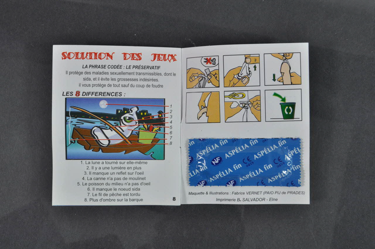 La petite brochure est constituée d'une couverture, quatre pages imprimées recto verso, et renferme un préservatif.