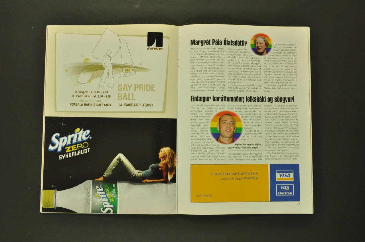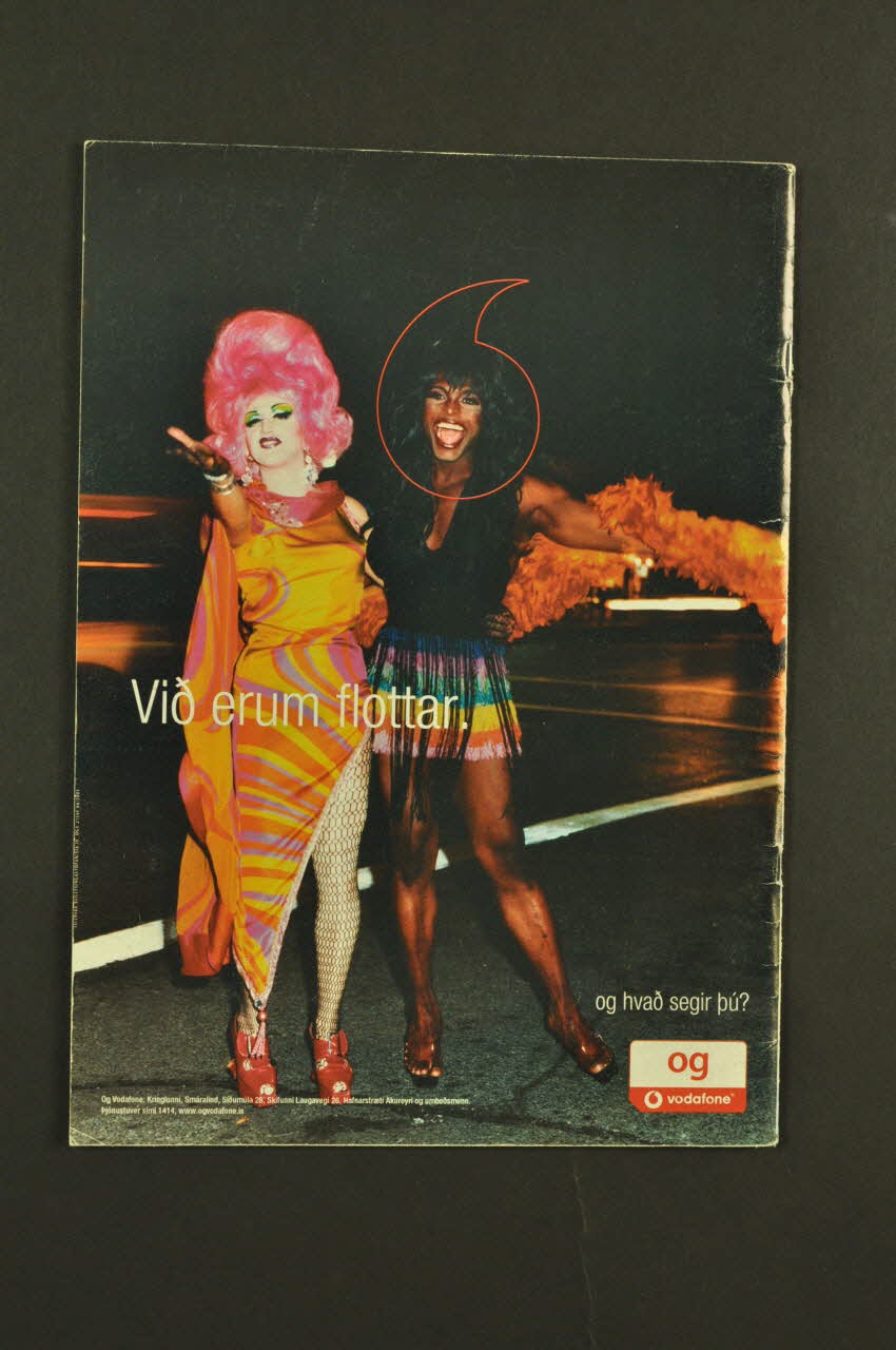 La couverture présente le nom d'un évènement en larges caractères roses en son centre, avec autour des photographies rondes en couleur : hommes, femmes, dont certains déguisés (photographies prises lors de parades gays). La quatrième de couverture est une publicité constituée d'une photographie couleur pleine page figurant deux drag queens, sur de l'asphalte, de nuit. L'intérieur de la revue est composé de textes en islandais dont certains sont traduits en anglais, illustrés de photographies couleur, et de publicités.Inscriptions