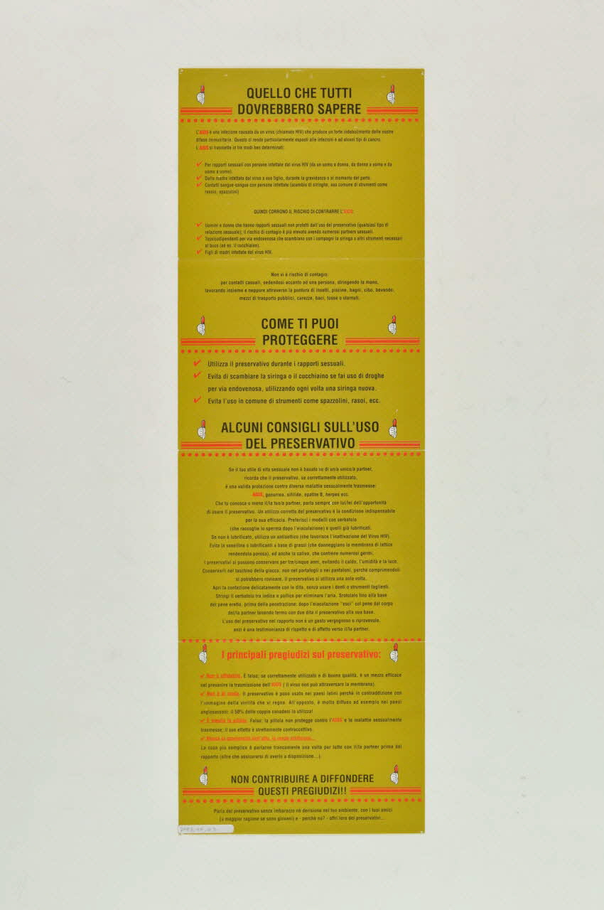 QUELLO CHE TUTTI / DOVREBBERO SAPERE [...] / COME TI PUOI / PROTEGGERE [...] / ALCUNI CONSIGLI SULL'USO / DEL PRESERVATIVO [...] / I principali pregiudizi sul preservativo: [...] / NON CONTRIBUIRE A DIFFONDERE / QUESTI PREGIUDIZI!! (En lettres noires et rouge sur le verso de l'affiche. Seuls les Titres et le sous-titre ont été transcrits.), versoL'AIDS E GLI / ADOLESCENTI / Si parla molto oggi dell'AIDS ma non sempre nel modo piu corretto: spesso questo argomento è circondato da paura, vergogna, desinformazione. / E importante invece avere informazioni corrette per sapere come comportarsi in modo da protteggere e salvaguardare la propria salute; / questo vale per tutti ma in particolare per i giovani, ragazzi e ragazze. / L'AIDS è una malattia evitabile, perchè è legata a determinati comportamenti / che noi possiamo modificare. / La prevenzione è attualmente il solo mezzo efficace per combattere la sua diffusione. / Non bisogna trascurare di proteggersi oggi aspettando i rimedi di domani! (En lettres noires et le mot (aids) en rouge. Le titre est en taille de caractère plus grande.), rectoLogo