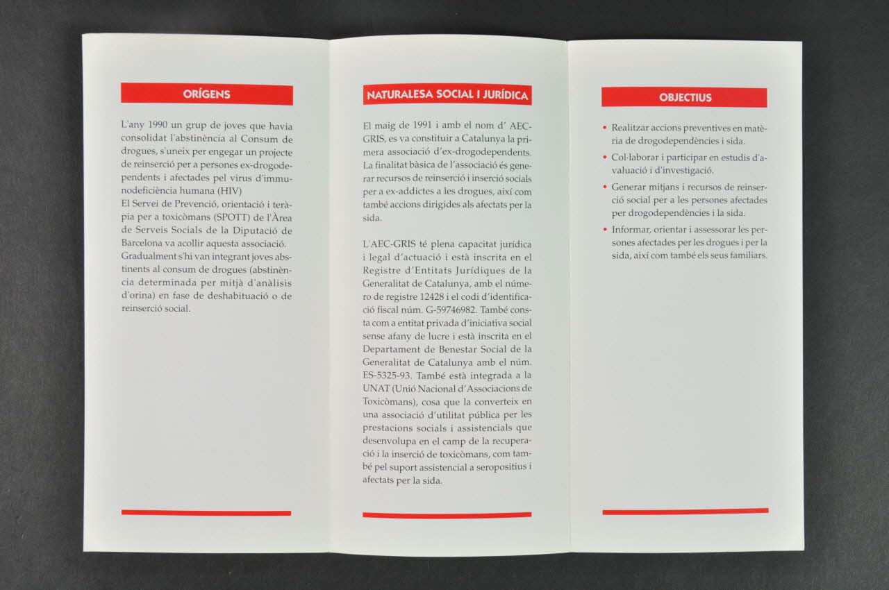 Associacio d'ex-drogodependants // de Catalunya // Grup per a la Reinsercio // i insercio Socials (de l'arrière du dépliant), en basTitre