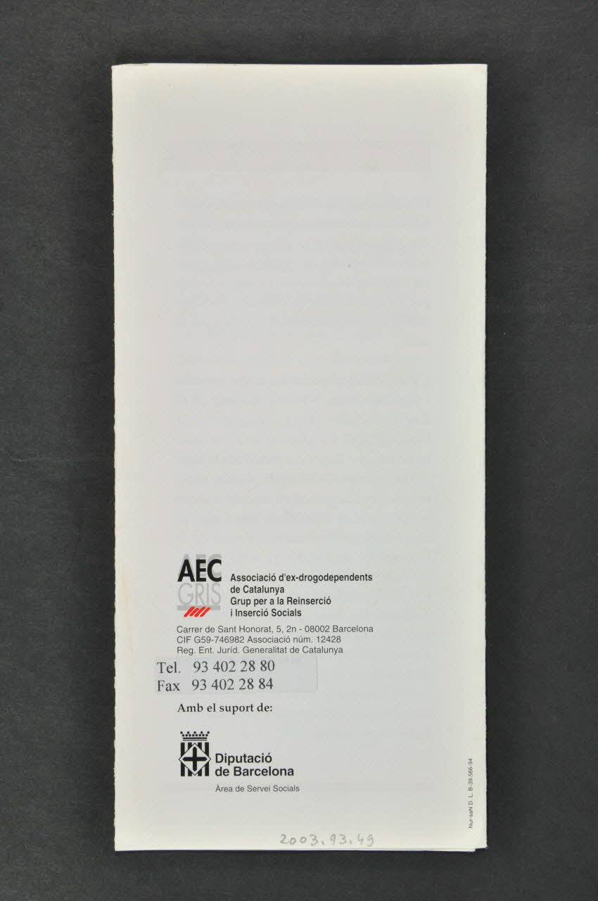 Diputacio // de Barcelona // Area de Servei Socials (logo de partenaire, en noir dans l'angle inférieur gauche de l'arrière du dépliant), en basAdresse