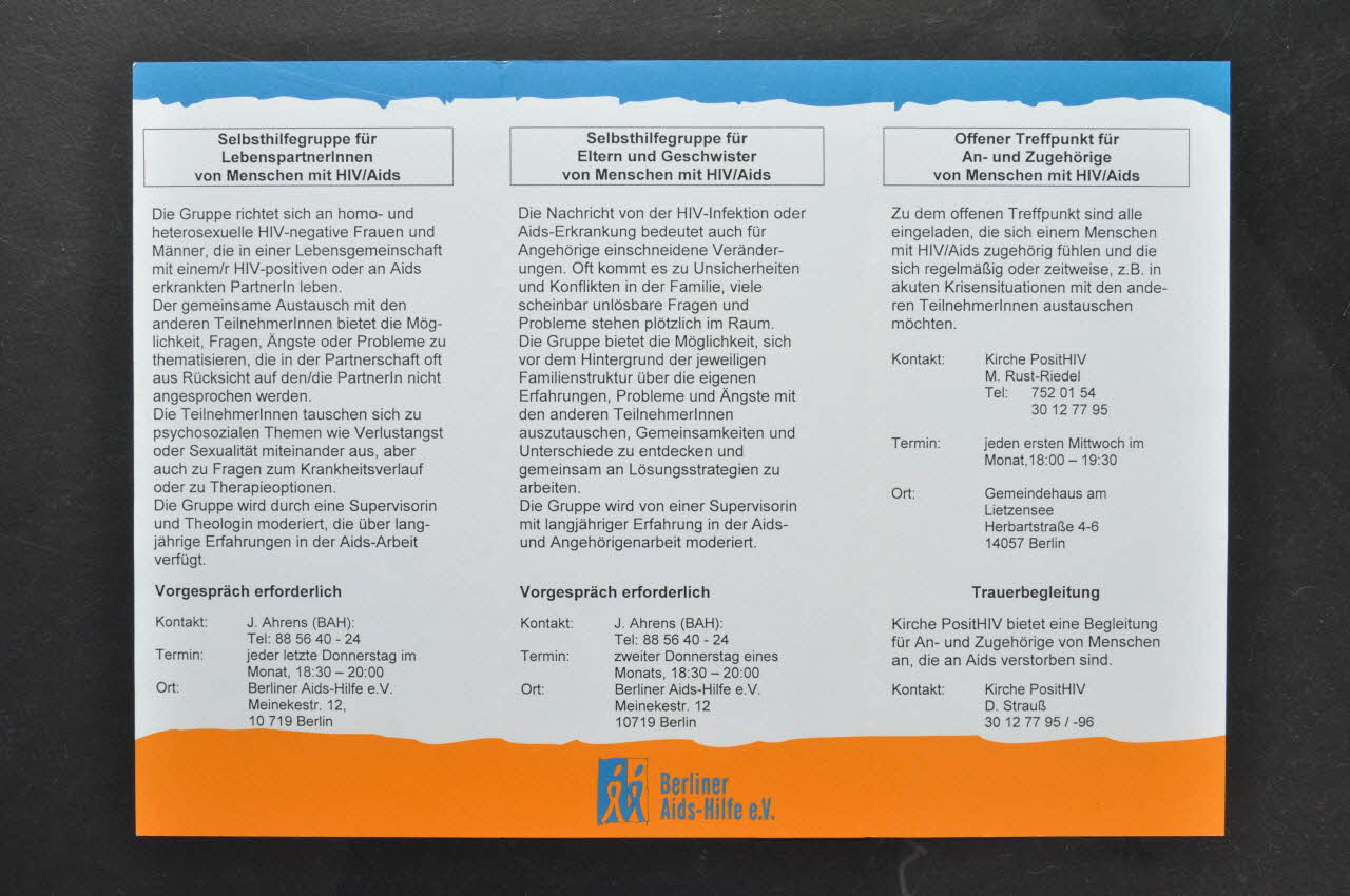 Berliner // Aids-Hilfe e.V (dans la plaquette, dans le bandeau orange, en bleu), sur la couvertureEine Kooperation zwischen // // KIRCHE positHIV // Ökumenische AIDS-Initiative // // und // // Berliner // Aids-Hilfe e.VAdresse, nom d'association, logo