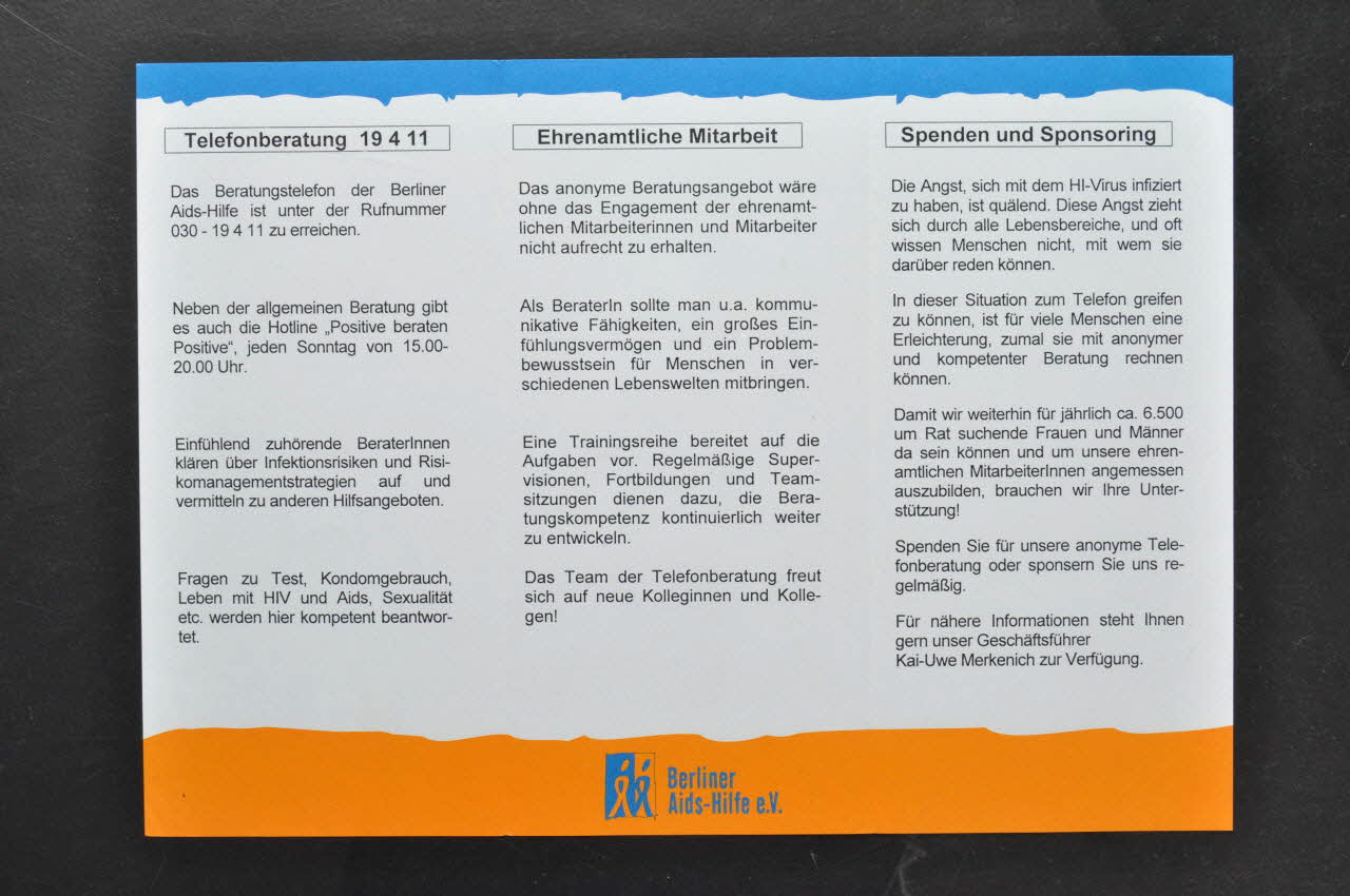 Berliner // Aids-Hilfe e.V (et dans la plaquette, en bleu dans un bandeau orange), sur la couvertureTexte, date