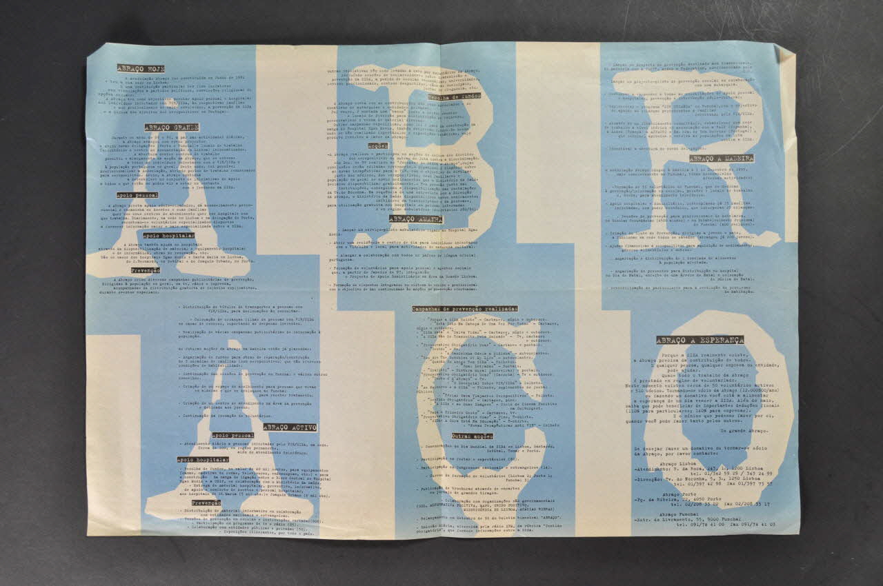 Précisions sur le contenu : Abraço aujourd'hui : association de lutte contre le sida constituée en juin 1992. Objectifs : donner un appui aux personnes touchées par le VIH/Sida, à leurs familles et aux professionnels de santé, prévention du sida et défense des droits des séropositifs au Portugal. Une association qui a grandi : appui socio-économique et psychologique, aide à l'équipement des hôpitaux, campagnes de prévention, séances d'information : écoles, centres de jeunes... ; récolte de fonds ; réalisation d'une journée d'éthique en décembre 1995; pression sur les institutions pour distribution gratuite des médicaments Abraço demain (projets de centres de soin, de formation de professionnels, projet de prévention pour les transsexuels, de prévention scolaire, programme pour les enfants de famille touchées par le sida, réseau au niveau ibérique) Abraço à Madère (depuis décembre 1995) Abraço actif : aide à domicile (autour de 100 personnes) ; récolte de fonds pour équipement hospitalier : lits, fauteuils roulants, téléviseurs, endoscopes : hôpitaux Egas Moniz, St Maria et Joaquim Urbano ; distribution de matériel de prévention ; 900 séances dans les écoles ; 50 séances dans des entreprises ; expositions itinérantes Campagnes de prévention réalisées - Porque a Sida existe (Parce que le sida existe) - Meta isto na cabeça de Uma Vez por todas (Mets cela dans ta tête une fois pour toutes) - Sida mata et Salva vidas (Mort du sida et Sauve des vies) - A sida nao se transmite pela amizade (Le sida ne se transmet pas par l'amitié) - Preservativo Obrigatorio Usar (Préservatifs : usage obligatoire) - Gestos (Gestes) - A Caminsinha Odeia a Sidinha (La petite chamise qui hait le sida) - You are the sunshine of my life (Vous êtes le soleil de ma vie) - Quando um amigo tem sida (Quand un ami a le sida) - Boas entradas (Bonnes entrées) - Grafitti - Preservativo Obrigatorio Usar (Préservatifs : usage obligatoire) - Porto è d'Abraço (Porto est à Abraço) - O essencial sobre VIH / Sida (L'essentiel sur le VIH / Sida) - As Mulheres e a sida (Les femmes et le sida) - Ferias para viajantes seropositivos (Vacances pour voyageurs séropositifs) - Sentido obrigadorio (Sens obligatoire) - A Sida e as suas imagens ( Le sida et ses images (cycle de cinéma) - Faça o primiero gesto (Fais le premier geste) - Preservativo Obrigatorio Usar (Préservatifs : usage obligatoire) - Sida A cura esta na educaçao (Sida le soin est dans l'éducation) - Novas terapeuticas anti VIH (Nouvelles thérapeutiques contre le VIH) Autres actions - Comémoration de la journée mondiale du sida - Fêtes et spectacles (80) - Congrés nationaux et étrangers (14) - Cours de formation de volontaires (6) - Brochures, encarts dans journaux de grand tirage - Collaboration avec autres associations - Relance du bulletin depuis septembre 96 - Emission quotidienne radio XFM Abraço et espoir Besoin d'aide. Il existe en ce moment 50 volontaires actifs et 510 membres de l'association. Importance des dons (12.000 $ par an), permettent des déductions fiscales. Coordonnées d'Abraço