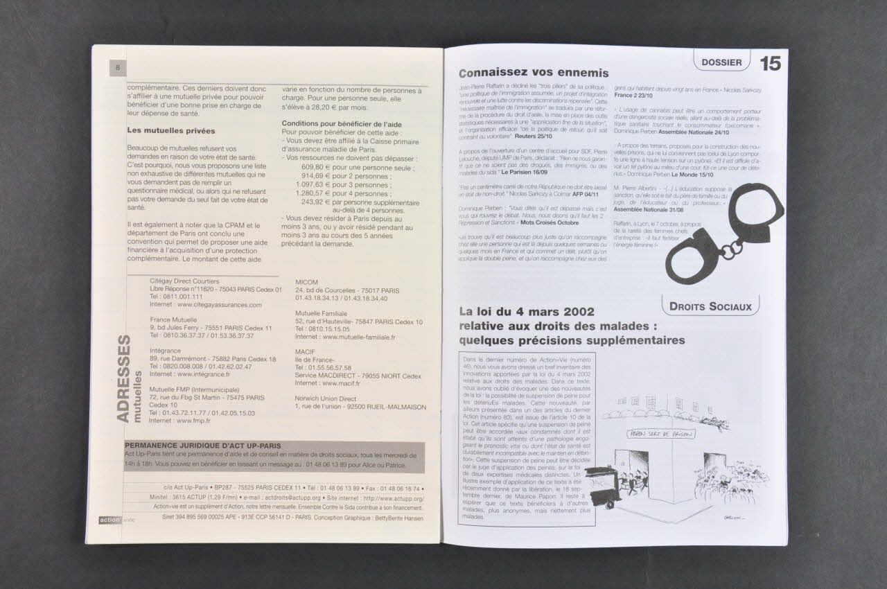 Résumé: Editorial : Explication du mot d'ordre du 1er décembre :"Politique sécurotaire, catastrophe sanitaire" p.4-7 Act Up en action. Série de photos noir et blanc de zaps, de pancartes, et sur le bord droit des pages de droite, calendrier avec les actions pour octobre et novembre : contre le laboratoire Schering Plough (désinformation sur effets secondaires) / Coca cola en Afrique.... p. 8-12 Dossier : Les conséquences sanitaires d'une politique sécuritaire. (p.8 en noir et blanc pleine page, reproduction de l'affiche "Sida politique sécuritaire catastrophe sanitaire) : Des prostituéEs criminaliséEs, Sans papiers, sans droits, Une approche répressive des drogues, Trop de malades en prison p. 13-14 Journal des répressions (témoignages : prostitution, étrangers, prison p. 15 Connaissez vos ennemis (citations d'hommes politiques) p.15 Droits sociaux : sur la possibilité de suspension de peine aux détenus malades p.16-17 Journée d'action internationale contre Coca-Cola pour exiger la prise en charge des traitements de leurs employéEs séropositifVEs p.18-19 Nord Sud, G8, nouvelles p.20 Traitements et recherche : refus de prendre en compte les avis des malades p.22-23 Nouvelles de l'association p.24 AG de la prévention p.25 Les femmes, toujours oubliées de la prévention et de la recherche Encart de 8 pages sous forme de dépliant au centre, en noir sur fond jaune : "Action = vie. Bulletin d'information sociale pour les personnes atteintes par le VIH, n° 47. Dossier : Les mutuelles. La Couverture Maladie Universelle /Tableau de prestations offertes par la CMU/ Les mutuelles privées