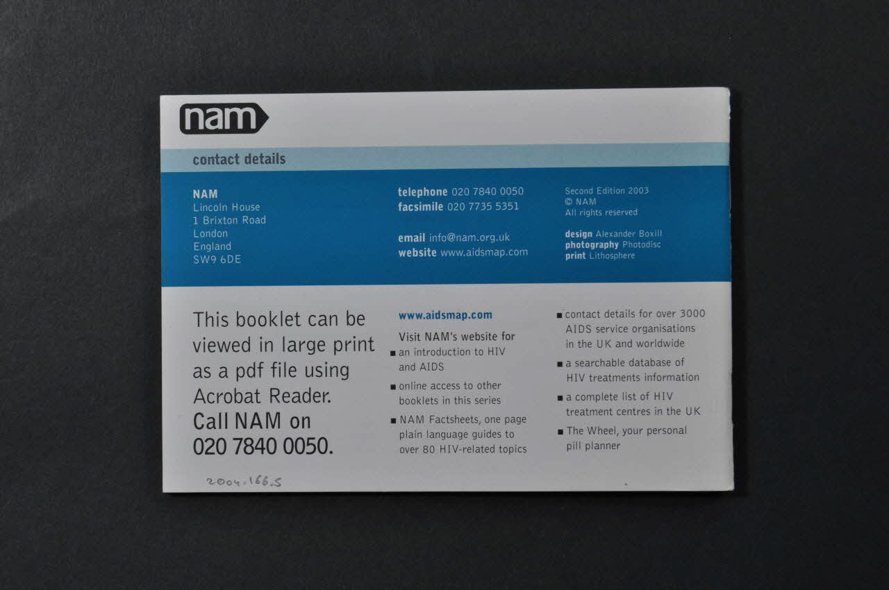 information series for hiv-positive people (inscription en gris sur fond bleu clair dans la bande verticale en haut de la couverture, au-dessus du titre), sur la couvertureDécor