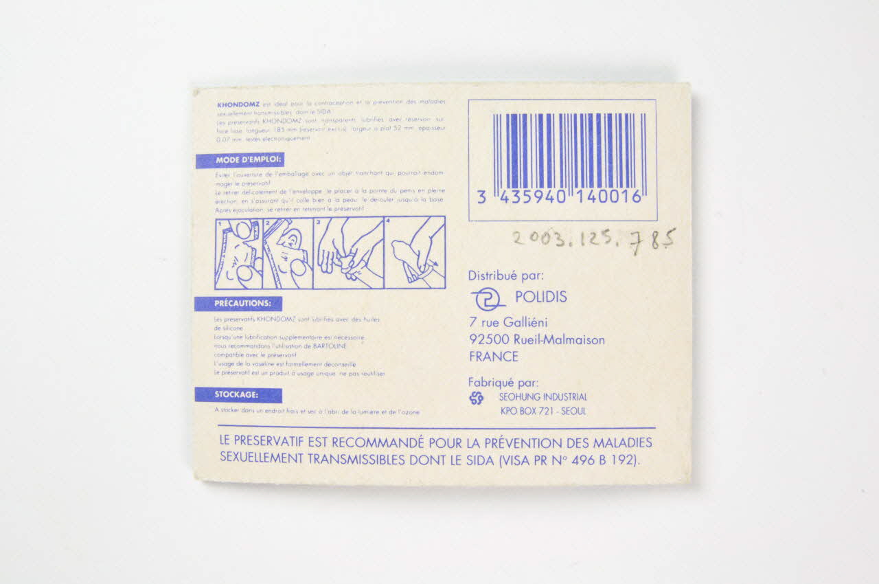Le recto à fond bleu présente, en haut à gauche, des inscriptions en blanc, au centre le logo de l'Agence Française de Lutte contre le Sida, à droite les logos de norme NF, du Ministère de la Jeunesse et des Sports, du Syndicat National des Discothèques et Lieux de Loisir. Au dos, sur fond blanc, en tout petits caractères bleus figure un mode d'emploi , les caractéristiques du préservatif, des conseils d'utilisation en quatre très petits schémas légendés.Inscriptions