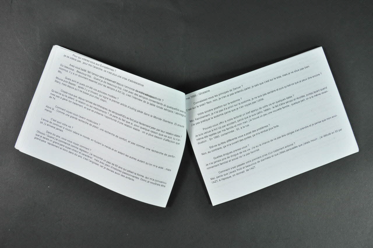 En 1983, des sidéens de la côte ouest et de la côte est se rassemblent pour la première fois, à l'occasion du deuxième Congrès national sur le sida qui se tient à Denver. Tous ont le sentiment d'avoir été déssaisis de leur autonomie. Les malades réunis à Denver rédigent une charte que l'on peut considérer aujourd'hui comme l'acte de naissance de l'activisme sida. Son préambule est une mise au point lexicale, ils refusent d'être traités comme des "victimes" et estiment qu'ils ne sont des "patients" qu'à l'occasion de tel ou tel acte médical. Ces deux termes évoquent en effet "l'impuissance", la "dépendance" et la "passivité" : "Nous sommes des personnes atteintes par le sida (People With AIDS - PWA). Et "Nous luttons pour notre vie". Nous activistes-sida, prenons les engagements suivants : 1. Ne pas abdiquer en confiant notre destin à d'autres que nous-mêmes. 2. Former des comités, choisir des représentants, établir une parole collective. 3. Nous adresser aux médias et décider démocratiquement des stratégies employées et l'ordre des priorités. 4. Etre partie prenante à tous les niveaux de décisions. 5. Participer à tous les colloques sur le sida, y bénéficier d'une crédibilité égale à celle des autres intervenants. 6.S'engager à adopter des pratiques à moindre risque, informer les partenaires sexuels éventuels de notre état de santé. 7. Avoir accès à des soins médicaux et à des services sociaux de qualité, sans discriminations d'aucune sorte relative à notre orientation sexuelle, notre sexe, notre état de santé, notre statut économique, ou notre race. 8. Recevoir des explications complètes sur toutes les procédures médicales et sur les risques qu'elles comportent. 9. Pouvoir choisir et refuser les modalités des traitements proposés. 10. Prendre des décisions pour notre vie en toute connaissance de cause. Pages suivantes : entretiens, généralement de 3 pages avec les personnes nommées au dos de la brochure (23 hommes et 5 femmes), prénoms, parfois initiales du nom, certains reconnaissables par le contenu de l'entretien, comme Didier ou Philippe M. Mêmes questions posées à chacun entre février et juin 1999 - Connaissez vous les principes de Denver? - Votre sincère position sur la sodomie? - Pouvez-vous offrir à notre lectorat un bref aperçu de votre vie en quelques dates? - Est-ce qu'être différent (e) vous a posé des problèmes? - Quelles drogues prenez-vous? - Comment s'est passée viotre première prise d'un traitement antiviral? - Comment s'est passée l'annonce de votre séropositivité dans viotre famille, à votre relation stable? - Avez vous trouvé une girl-friend (un boy-friend) à Act Up? - A quelle date vous êtes-vous rendu compte que, grâce aux trithérapies, vous n'alliez pas mourir si tôt que ça? - Quel a été votre parcours militant avant d'arriver ici? - Quelle fut votre plus forte période de burn out? Pourquoi? - Quelle était votre sérologie quand vius êtes arrivé (e) à Act Up-Paris? - Vous annoncez tout de suite la couleur (votre séropositivité) lors de vos émois sexuels? - Pour qui voterez-vous aux Européennes? - Avez vous baisé, fait l'amour sans préservatif depuis l'annonce de votre séropositivité? - Quels sont et quels ont été vos activistes modèles? - Croyez-vous que depuis l'arrivée des trithérapies, les séropositif(ve)s se font plus facilement jeter par leur relation stable? - Comment voyez-vous l'avenir moléculaire? - C'est quoi votre vie? - Dans dix ans, vous vous voyez comment?