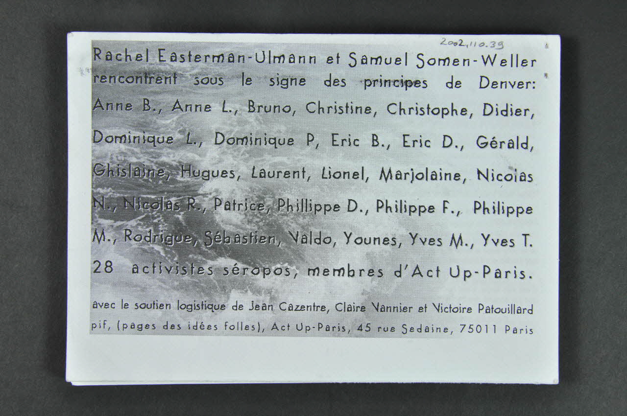 Rachel Easterman-Ulmann et Samuel Somen-Weller // rencontrent sous le signe des principes de Denver : // Anne B., Anne L., Bruno, Christine, Christophe, Didier, // Dominique L., Dominique P., Eric B., Eric D., Gerald, // Ghislaine, Hugues, Laurent, Lionel, Marjolaine, Nicolas // N., Nicolas R., Patrice, Philippe D., Philippe F., Philippe // M., Rodrigue, Sébastien, Valdo, Younes, Yves M., Yves T. // 28 activistes séropos, membres d'Act Up-Paris. // // avec le soutien logistique de Jean Cazentre, Claire Vannier et Victoire Patouillard. // pif (pages des idées folles), Act Up-Paris, 45 rue Sedaine, 75011 Paris (En noir sur l'ensemble sur verso), versoDécor