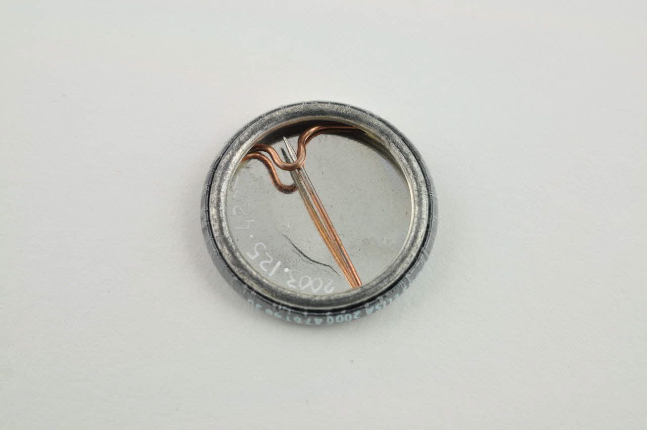 structure en fer et atache en cuivre. / Badge circulaire dont la structure en tôle de fer est recouverte de papier imprimé et plastifié.