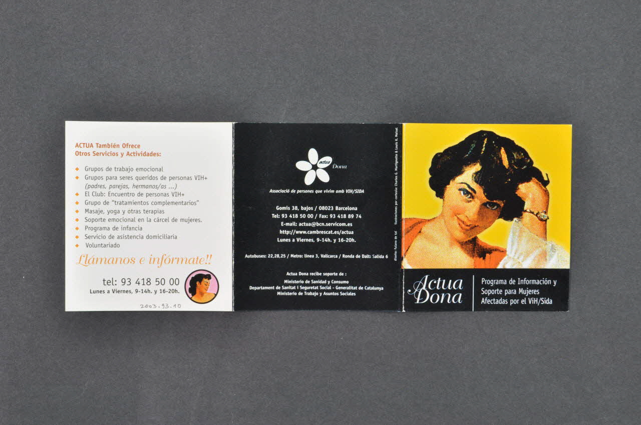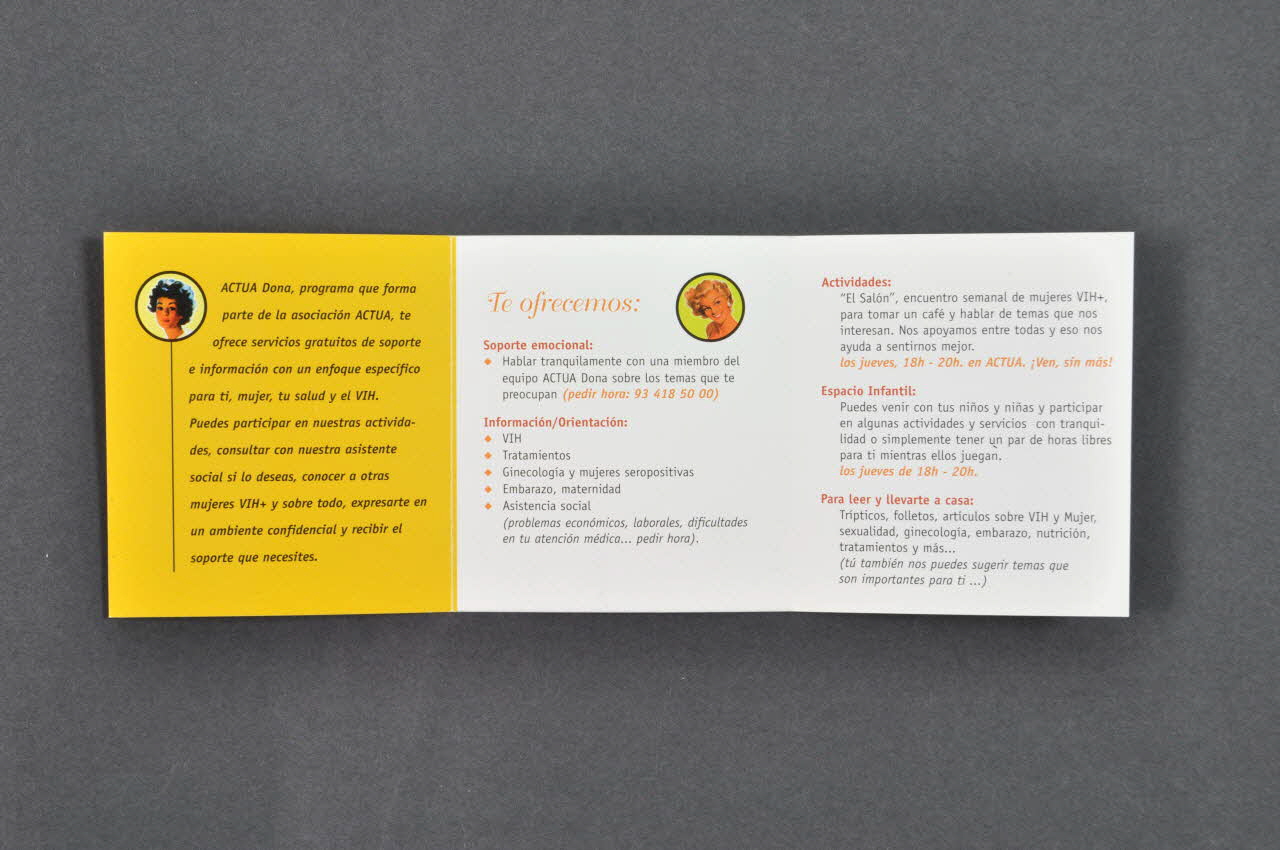 Te ofrecemos : / Soporte emocional : / [...] / Informacion / Orientacion : / [...] / Actividades : / [...] / Espacio Infantil : / [...] / Para leer y llevarte a casa : / [...] / ACTUA Tambien Ofrece / Otros Servicios y Actividades : / [...] / Llamanos e informate !! / tel : 93 418 50 00 / Lunes à Viernes, 9-14h. y 16-20h. (Sur les volets intérieurs du centre et de droite ainsi que sur le volet se repliant à l'intérieur, liste des services offerts par l'association imprimée en orange, rouge et noir.), à l'intérieurACTUA Dona, programa que forma / parte de la asociacion ACTUA, te / ofrece servicios gratuitos de soporte / e informacion con un enfoque especifio / para ti, mujer, tu salud y el VIH. / Puedes participar en nuestras activida- / des, consultar con nuestra asistente / social si lo deseas, conocer a otras / mujeres VIH + y sobre todo, expresarte en / un ambiente confidencial y recibir el / soporte que necesites. (Texte d'introduction imprimé en noir sur fond jaune, sur le volet intérieur gauche.), à l'intérieurDécor