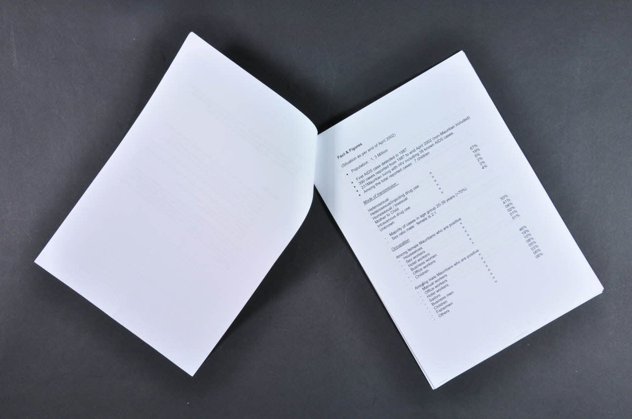 La couverture porte un titre, avec des coordonnées en dessous, et au dessus une carte, probablement de l'île Maurice, avec un ruban noir et trois initiales. Le dos est vierge. A l'intérieur les feuilles, imprimées d'un seul côté, portent des texte et des données chiffrées.Inscriptions