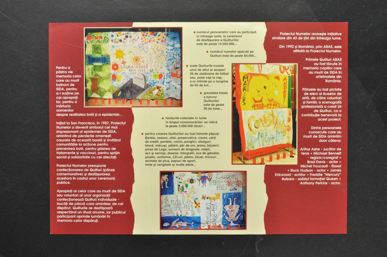La couverture du dépliant est de couleur jaune clair. Sur le devant se prolongeant sur le dos, se trouve une photographie d'une partie de carrés (patchwork assemblés). Il s'agit de patchworks réalisés pour des enfants très jeunes (2 à 5 ans) : noms et dates indiqués : Eugen (1988-1992), Lena (1986-1991), Adriana (1988-1991, Erdal (1988-1990). ils sont très colorés, avec fleurs, papillons, oiseaux, soleil. En bas, des bougies rouges. Dans le haut, se trouve les logos de ARAS et de UNICEF et en dessous, en caractères bruns le titre de la revue. Au dos, en haut, on trouve numéro de la ligne téléphonique gérée par l'association ARAS : Sida Helpline. A l'intérieur le premier, le troisième et le quatrième feuillet sont partiellement bruns, avec des impressions en blanc, le feuillet central jaune clair. On trouve une illustration par trois parties de carrés avec des bougies en bas. L'un reproduit celui de la couverture. Pour les deux autres, il s'agit toujours de penneaux d'enfants : Marius Andrei (1988-1991), Constanza (1987-1990), Laura-Maria (1989-1993), Mihai (1989-1993), Flurin (1990-1993) Textes : - Feuillet 1 : Historique, but (mémoire) - Feuillet 2 : quelques chiffres du quilt total (50 tonnes, 60 km...), variété des objets insérés sur le Quilt (poupées, préservatifs, bijoux, jeans, légos, seringues, dessins, photos, CD, uniformes, pierres, peluches, ... - Feuillet 3 Le quilt Roumain . Les premiers en 1992, fait en mémoire des enfants morts du Sida dans les orphelinats de Roumanie. Il existe 24 quilts. Autres personnalités pour lesquelles quilts sont été réalisés : Arthur Ashe (joueur de tennis), Michael Bennett (chorégraphe), Brad Davis (acteur, Michel Foucault, Rock Hudson, James Kirkwood (écrivain), Freddie Mercury, Anthony Perkins. Le 4ème feuillet intérieur dispense des conseils pour réaliser un kilt.Décor