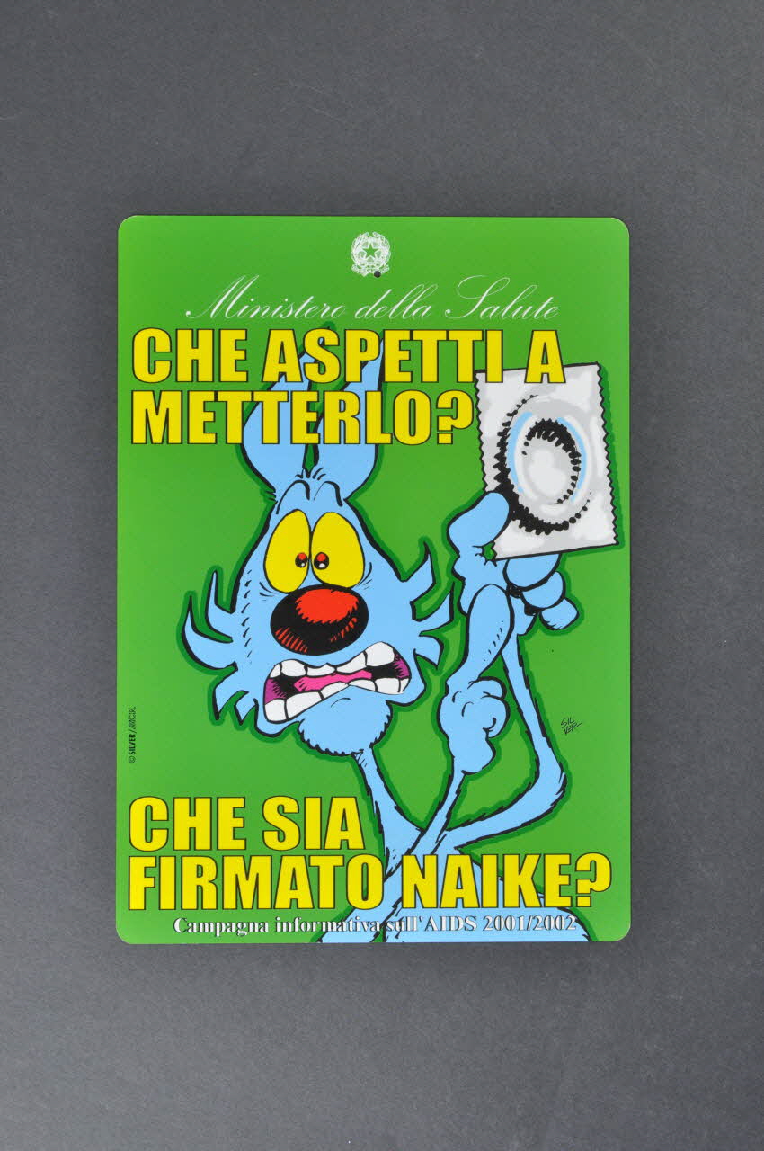 L'affichette présente sur fond vert, en haut, en italiques blanches, le logo du Ministère de la santé italien. Dessous est représenté un dessin style BD, figurant un chien bleu, l'air affolé, désignant un préservatif carré blanc qu'il tient dans sa main gauche. Des inscriptions en grandes capitales jaunes, encadrent le dessin.Inscriptions