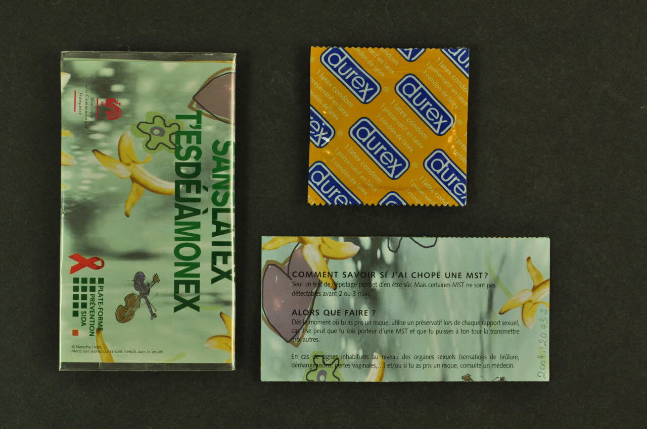 Le papier sur fond vert est un dépliant avec plusieurs inscriptions sur les deux faces. La couverture présente sur le fond des dessins de bananes demi-épluchées ainsi qu'un dessin vert en forme de préservatif, avec une inscription en blanc. Le dos de couverture a le même fond avec des bananes ainsi que deux violons en bas à gauche, un ruban rouge, des petits carrés verts ayant à droite des inscriptions en vert. Au fond à droite on trouve un logo en forme de coq en rouge, avec des inscriptions en bas. Le dos de la couverture présente aussi des inscriptions en capitales vertes, en haut.Inscriptions