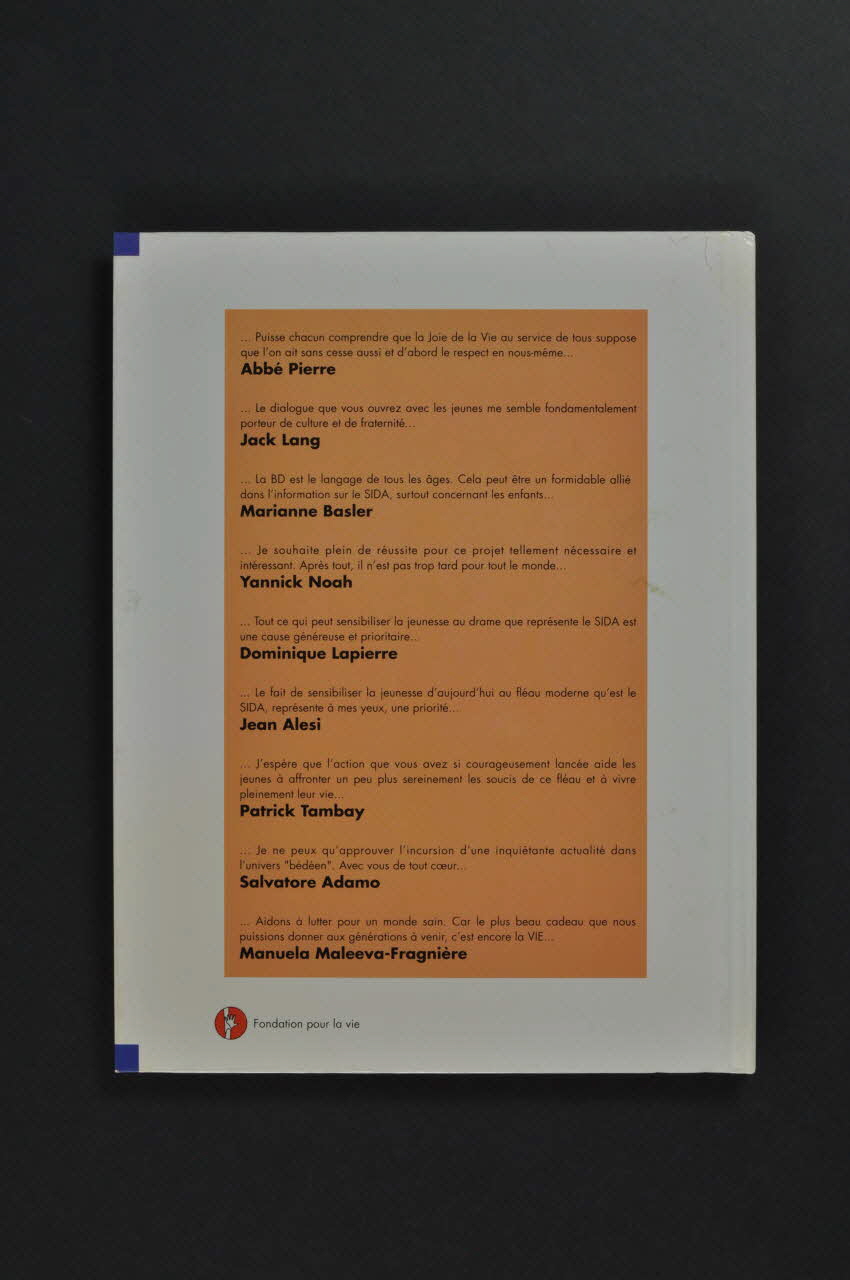 Dos de couverture : rectangle central orange avec neuf citations de personnages célèbres en soutien à la bande dessinée : Abbé Pierre, Jack Lang, Marianne Basler, Yannick Noah, Dominique Lapierre, Jean Alesi, Patrick Tambay, Salvatore Adamo, Manuela Maleeva-Fragnière.