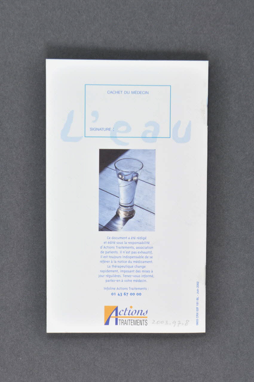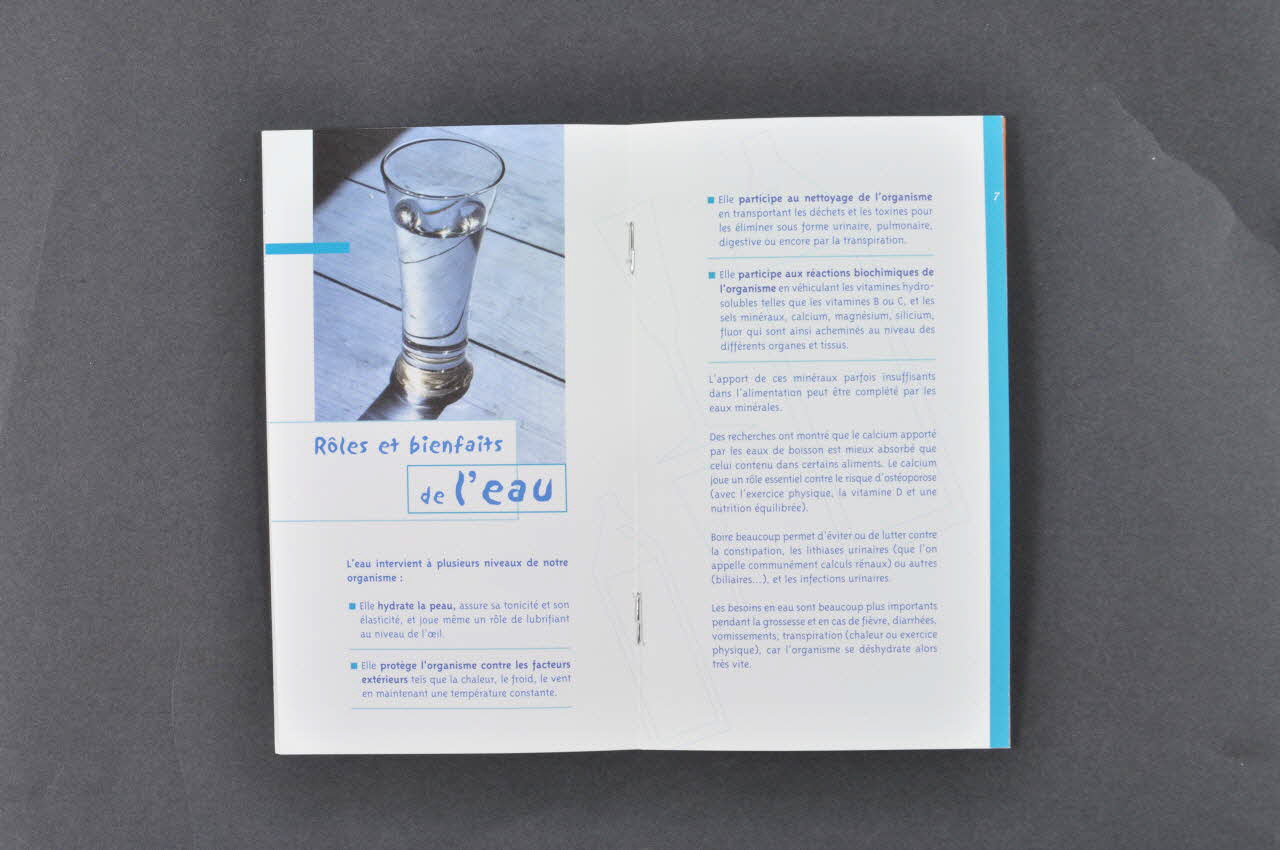 L'eau / est un élément essentiel à la vie. / Elle est le composant principal / de notre organisme et représente / 60 à 70 % du poids corporel chez l'adulte / (jusqu'à 75 % chez le nourrisson). / [...] / Les eaux / en bouteilles / Il existe différents types d'eaux de boisson / vendues en bouteilles : / les eaux minérales, / plates ou gazeuses / [...] / les eaux de source / [...] / les eaux traitées / rendues potalbes / [...] / Rôles et bienfaits / de l'eau / L'eau intervient à plusieurs niveaux de notre / organisme : / [...] / Votre médecin vous a prescrit / CRIXIVAN® / Vous devez boire au moins / 1,5 litre par jour. / [...] / après chaque prise, / [...] / entre les prises de Crixivan® / [...] / Vous prenez / Crixivan® / Objectif boissons quotidiennes : / au moins 1,5 litre par jour. [...] (A l'intérieur la brochure contient un texte en cinq parties avec chacune un titre inscrit en plus gros dans des cadres bleus turquoise. Il est imprimé en bleu.), à l'intérieurDécor