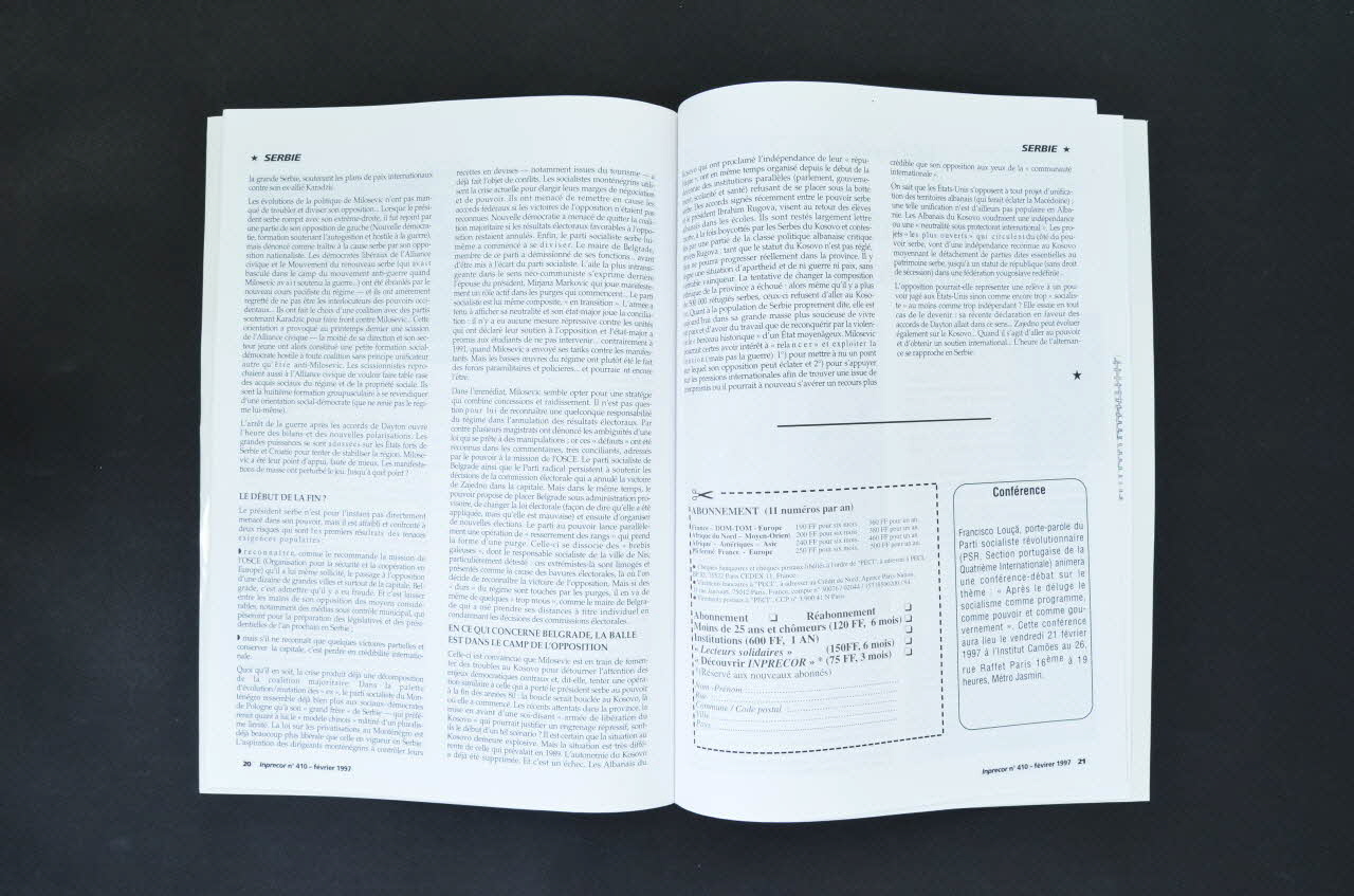 N° 410 de la revue "Imprecor" de février 1997 (revue franco-Belge; 4° internationale communiste) Toute la 1ère de couverture est composée d'une photo noir et blanc de la journée du désespoir organisée par Act Up. En premier plan trois cercueils avec sur l'un une tête de mort et 4 avril 1992 Sida : journée du désespoir" ; au second plan, quelqu'un (Emmanuelle Cosse??) qui court avec une pancarte; au second plan, dans la cour du Louvre, des manifestants derrière une grande banderole noire sur laquelle on distingue : Act Up Paris SIDA : la journée du désespoir. En vert, en surimpression, le titre du journal et le sommaire en en bas, en surimpression sur "SIDA : Journée du désespoir : "Sida : quel espoir?" A l'intérieur dossier de 14 pages : "Sida, l'épidémie n'est pas finie" : Cyril ROUSSEAU : Quel espoir ? Frank PROUHET Sida, pauvreté et oppression sexuelle Entretien avec Marc NECTAR, président d'Act Up-Paris (présentation d'Act Up, pouvoir des malades, trithérapie et nouvelles interrogations, toxicomanie, Tiers Monde) Lise THIRY Le Sida et l'Afrique subsaharienne Tavis BArr Triophérapie et profit aux Etats-Unis