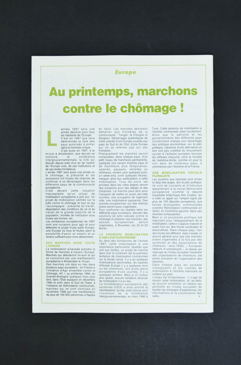 Il s'agit d'une revue composée de trente-six pages imprimées en noir sur blanc et reliées entre elles par deux agrafes. Le nom, le numéro, la date de la publication ainsi que quatre de ses grands titres sont visibles sur le bord gauche de la couverture. Son sommaire se trouve en page n°2. A l'intérieur, outre la grande quantité de texte on compte un certain nombre d'illustrations (photographies, dessins...). La quatrième de couverture présente un article traitant du chômage.Inscriptions