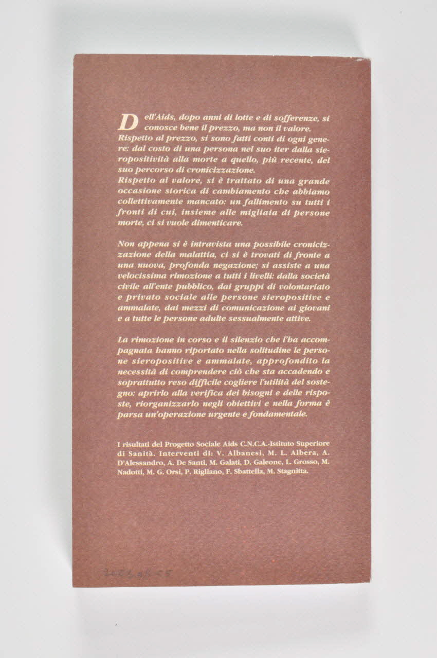 Livre en italien de 186 pages à couverture souple. Fond marron avec bandeau vertical baige sur le côté gauche avec illustration d'un livre ouvert inscrit dans un carré. Au dessus de l'illustration, verticalement "CNCA", en dessous, "Proposte". A droite, en haut, en brun clair : " AIDS il prezzo e il valore." (Sida, le prix et la valeur.). En dessous, en plus petits caractères : "Per una nuova accoglienza" (Pour un nouvel accueil). Tout en bas, le nom de l'éditeur :"Comunita Edizioni".