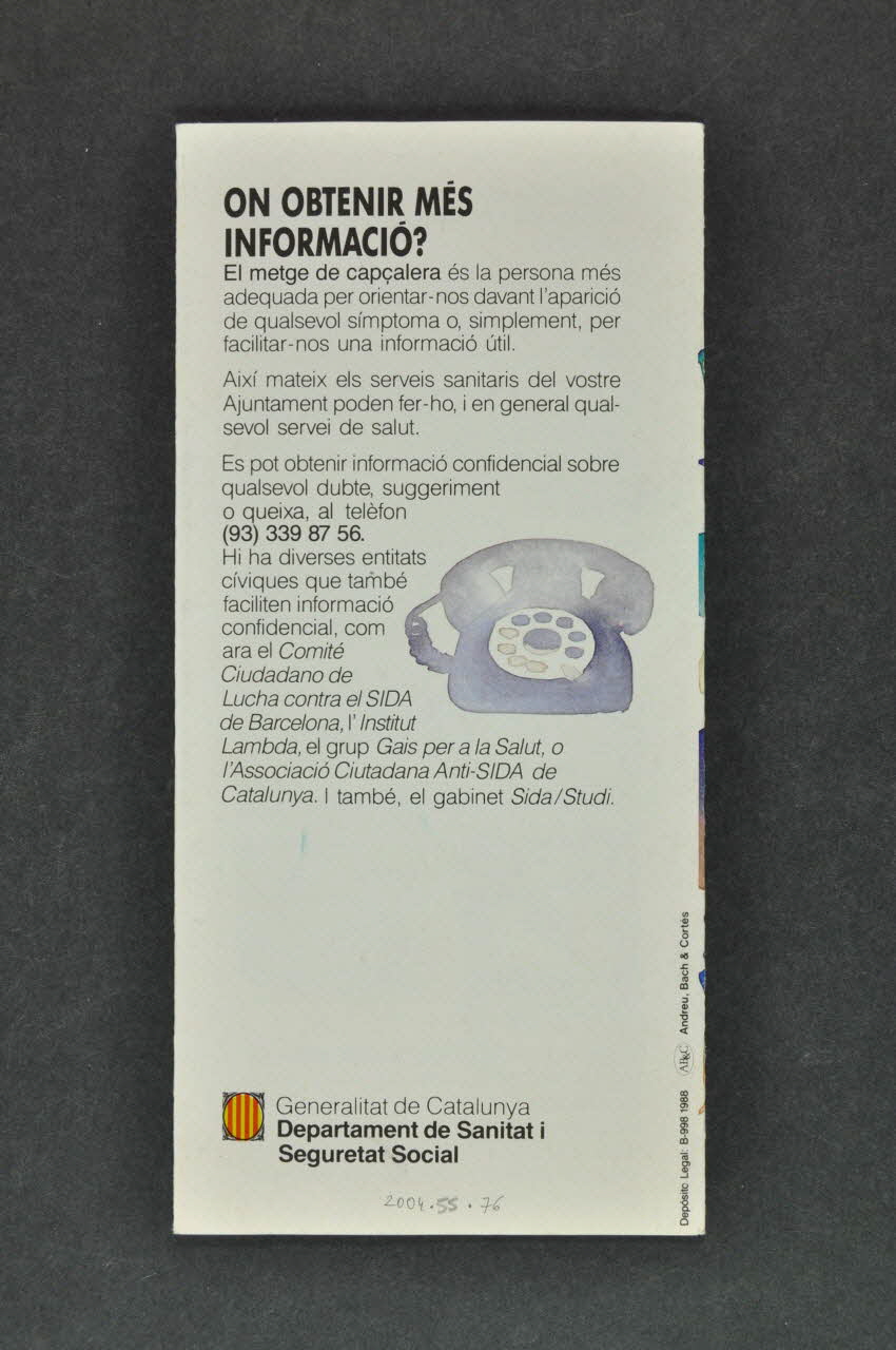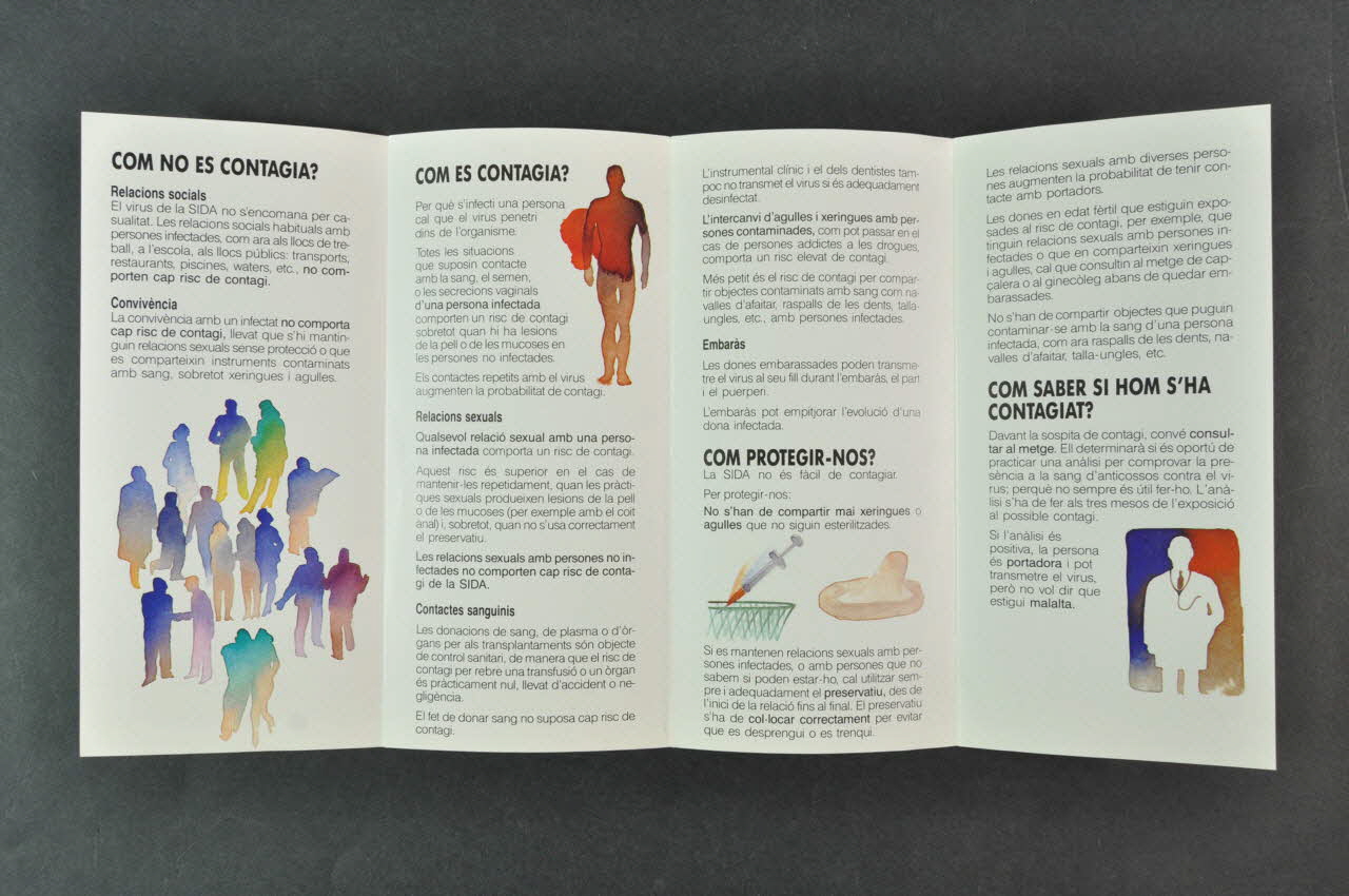 Genaralitat de Catalunya // Departament de Sanitat i // Seguretat Social (Logo contitué d'un motif ovale strié de jaune et rouge et placé dans un rectangle. A côté, du texte imprimé en noir), rectoQUE ES LA SIDA ? // ON ES TROBA EL VIRUS DE LA SIDA ? // COMO NO ES CONTAGIA ? // COM ES CONTAGIA ? // COM PROTEGIR-NOS ? // COM SABER SI HOM S'HA CONTAGIAT ? // QUE ES UN INFECTAT ? // QUE ES UN PORTADOR SA ? // QUE ES UN MALALT ? // ON OBTENIR MES INFORMACIO ? (Titres des parties imprimés en capitales noires sur fond blanc), à l'intérieurDécor