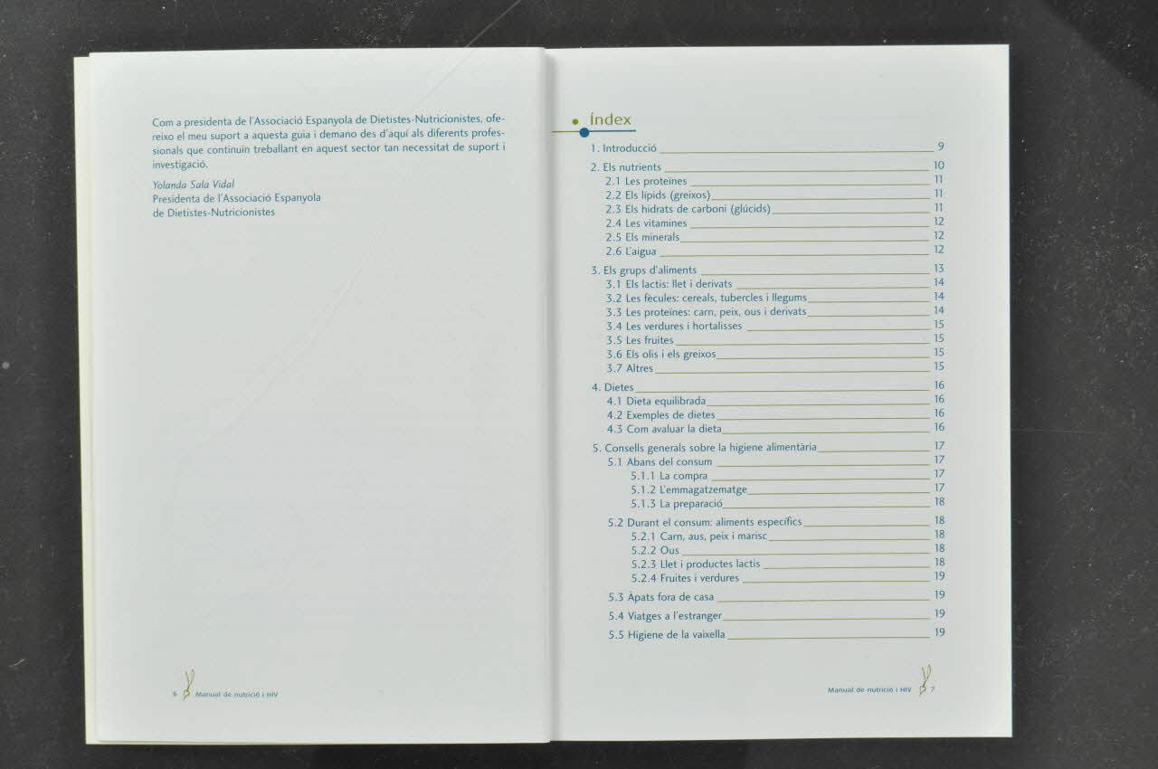 Index // // 1. Introducció // 2. Els nutrients // 3. Els grups d'aliments // 4. Dietes // 5. Consells generals sobre la higiene alimentària // 6. Consideracions especials // 7. L'exercici físic // 8. Consells dietètics per canvis metabólics a cause de la medicació // 9. Dubtes més habituals sobre l'alimentació // 10. Pàgines de consulta a Internet // ANNEXOS (page 7)Logo, nom d'association