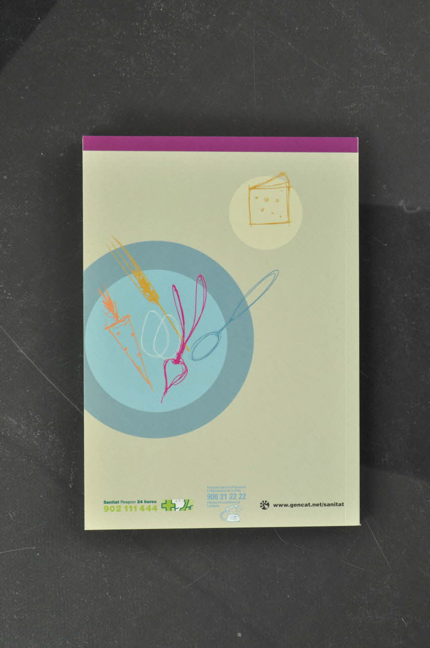 Au centre, il y a un dessin schématisé de fourchette, poisson, fruits... et au dessus, en blanc le titre du manuel. En bas on trouve le logo du département minsitériel à l'origine de cette campagne. Le dos a un fond gris, dessus on trouve des dessins de fromage, légumes... En bas, on peut voir les coordonnées téléphoniques du programme et son site internet. A l'intérieur, le fond est blanc avec des impressions en bleu et en vert (sous-titres).Inscriptions