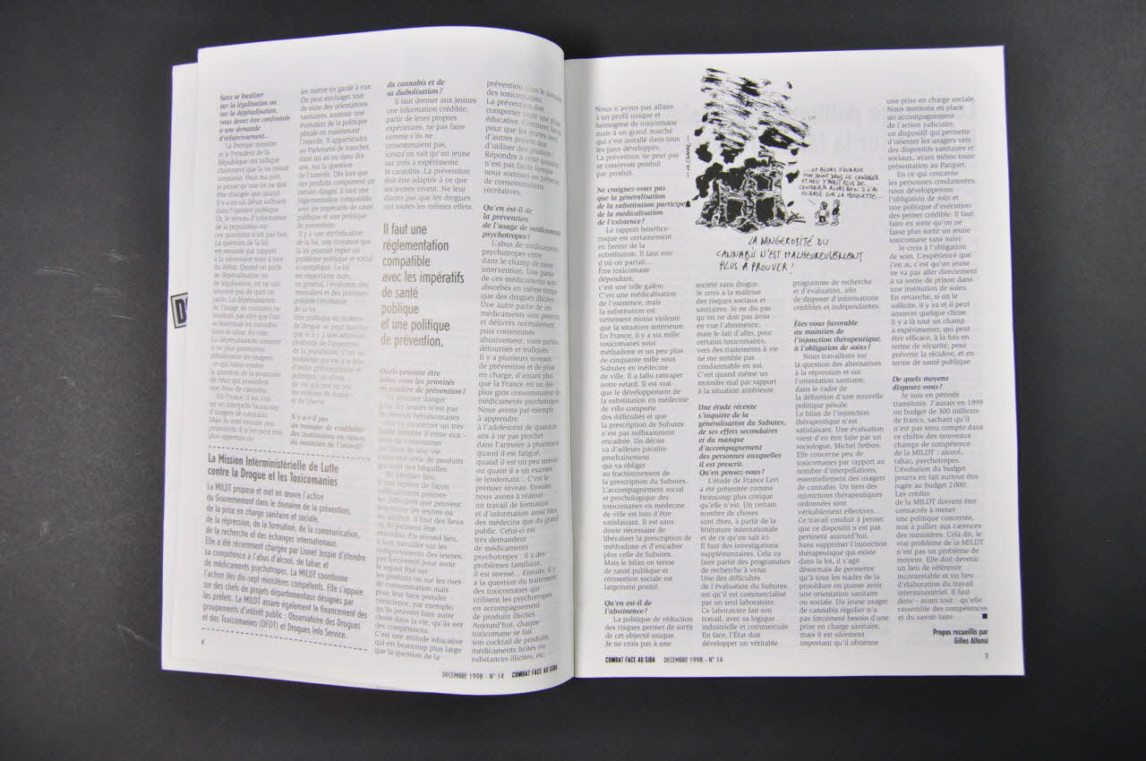Politique de la drogue // du gouvernement...4 // La courage politique d'ouvrir le débat // sur la loi de 70...8 // Sans-papiers algériennes: // la vie travestie // Reportage photo de Kader Atiia...9 // Pris en charge: // les espoirs et les craintes des soignants...15 // Les Nations-Unies // face à une épidémie // globale...17 à 24 // Enjeux...25 // La lutte contre l'homophobie: // une lutte pour l'émancipation humaine...28 // Le trottoir, l'arbre, le tas...30 // L'accompagnement au retour // à l'emploi: un enjeu de société...32 // Attentes et interrogations // de collégiens sur le sida...34 // Encart abonnement...I à IV (Le sommaire est marqué en caractères noirs à la page deux.), à l'intérieurSlogan