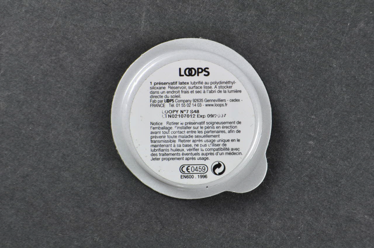 Un préservatif est rangé à l'intérieur.Inscriptions