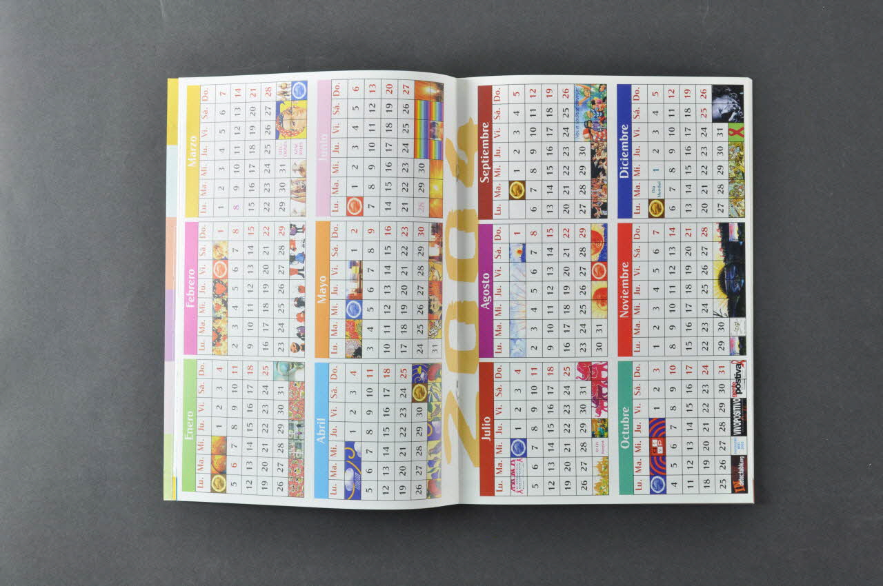 Au centre : calendrier détachable 2004 avec petites vignettes colorées : ruban rouge, préservatifs, arc en ciel...