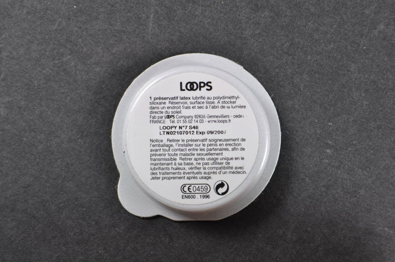 Un préservatif est rangé à l'intérieur.Inscriptions
