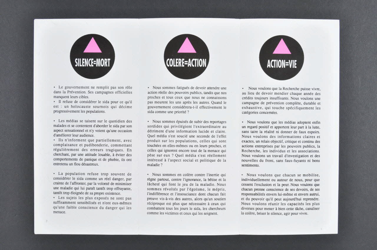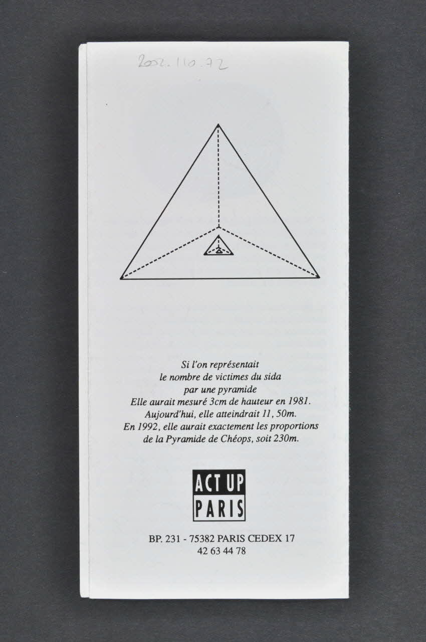 - Nous voulons que la Recherche puisse vivre, au lieu de devoir mendier chaque année des crédits toujours insuffusants. Nous voulons une campagne de prévention complète, durable et exhaustive, qui touche spécifiquement les catéégories concernées. // - Nous voulons que les médias adoptent enfin un regard positif et apportent leur part à la lutte, sans taire la réalité ni donner de faux espoirs. Nous voulons des informations claires et exactes, un relais objectif, critique et continu des actions entreprises par les pouvoirs publics, la Recherche, les individus et les associations. Nous voulons un travail d'investigation et des nouvelles du front, sans faux-fuyants ni bons sentiments. // - Nous voulons que chacun se mobilise, individuellement et autour de nous, pour que cesse l'exclusion et la peur. Nous voulons que chacun prenne conscience de ses devoirs, de ses responsabilités envers lui-même et envers autrui et du pouvoir qu'il peut aujourd'hui reprendre. Nous voulons réunir les capacités les plus diverses pour mener à bien cette tâche, canaliser la colère, briser le silence, agir pour vivre. (Texte du troisième volet intérieur imprimé en noir sur blanc), à l'intérieur- Le gouvernement ne remplit pas son rôle dans la Prévention. Ses campagnes officielles manquent leurs cibles. // - Il refuse de considérer le sida pour ce qu'il est : un holocauste sournois qui décime progressivement les populations. // - Les médias se taisent sur le quotidien des malades et se contentent d'aborder le sida par son aspect sensationnel et n'y voient qu'une occasion d'améliorer leur audience. // - Ils n'informent que partiellement, avec complaisance et pudibonderie, commettant régulièrement des erreurs tragiques. En cherchant, par une attitude louable, à éviter des comportements de panique et de phobie, ils ont entretenu un flou désastreux. // - La population refuse trop souvent de considérer le sida comme un vrai danger, par crainte de l'affronter, par la volonté de minimiser une maladie qui lui paraît tantôt trop effrayante, tantôt trop éloignée de leur propre existence. // - Les sujets les plus exposés ne sont pas suffisamment sensibilisés et n'ont eux-mêmes qu'une faible conscience du danger qui les menace." (Texte du premier volet intérieur imprimé en noir sur blanc), à l'intérieur- AGIR : Act-Up Paris est un groupe activiste. Lutter contre le sida, c'est aussi montrer du doigt les carences des autorités et dénoncer l'indifférence de la société. // - CONSEILLER : Act-Up Paris incite chacun à prendre conscience des implications du sida, qui n'est pas seulement une maladie, mais aussi un drame social et politique. // - TRAVAILLER : Act-Up Paris aide les individus à reprendre un pouvoir qu'ils ont trop longtemps délégué. Chacun d'entre nous se tient informé de tous les problèmes que peut rencontrer la lutte contre le sida et des solutions qui peuvent être apportées. // - UNIFIER : Act-Up Paris réunit des individus autour d'un but commun. le sida isole les malades. Seuls, nous ne pouvons rien. Ensemble nous pouvons combattre la maladie. // - PROTEGER : Act-Up Paris veut provoquer l'émergence d'une nouvelle attitude positive : en cessant de nier la réalité et en cherchant à développer toutes les alternatives crédibles dans la lutte contre la maladie. (Imprimé en noir sur blanc et divisé en paragraphes. La première lettre de chaque paragraphe est en blanc dans un rond noir. Ces lettres forment le nom de l'association.), à l'intérieurSi l'on représentait // le nombre de victimes du sida // par une pyramide. // Elle aurait mesuré 3 cm de hauteur en 1981. // Aujourd'hui elle atteindrait 11,50m. // En 1992, elle aurait exactement les proportions de la pyramide de Chéops, soit 230m. (Imprimé en italiques noires sur blanc), versoAgir Conseiller Travailler Unifier Protéger // 26.09.89. - Plaquette 001 - Ex. 1000 (Imprimé en petits caractères noirs sur blanc, dans le bas), sur la couverture- Nous sommes fatigués de devoir attendre une action réelle des pouvoirs publics, tandis que nos proches et tous ceux que nous ne connaissons pas meurent les uns après les autres. Quand le gouvernement considérera-t-il effectivement le sida comme une priorité? // - Nous sommes épuisés de subir des reportages sordides qui privilégient l'extraordinaire au détriment d'une information lucide et claire. Quel média s'est soucié une seconde de l'effet produit sur les populations, celles qui sont touchées en elles-mêmes ou en leurs proches, et celles qui ignorent encore tout de la menace qui pèse sur eux? Quel média s'est réellement intéressé à l'aspect social et politique de la maladie? // - Nous sommes en colère contre l'inertie qui règne partout, contre l'ignorance, la bêtise et la lâcheté qui font le jeu de la maladie. Nous sommes révoltés contre l'égoïsme, le mépris, l'indifférence et l'insouciance dont chacun fait preuve vis-à-vis des autres, alors qu'un soutien réciproque est plus que nécessaire à ceux qui combattent tous les jours le sida, les chercheurs comme les victimes et ceux qui les soignent. (Texte du deuxième volet intérieur imprimé en noir sur blanc), à l'intérieurLogo, nom d'association
