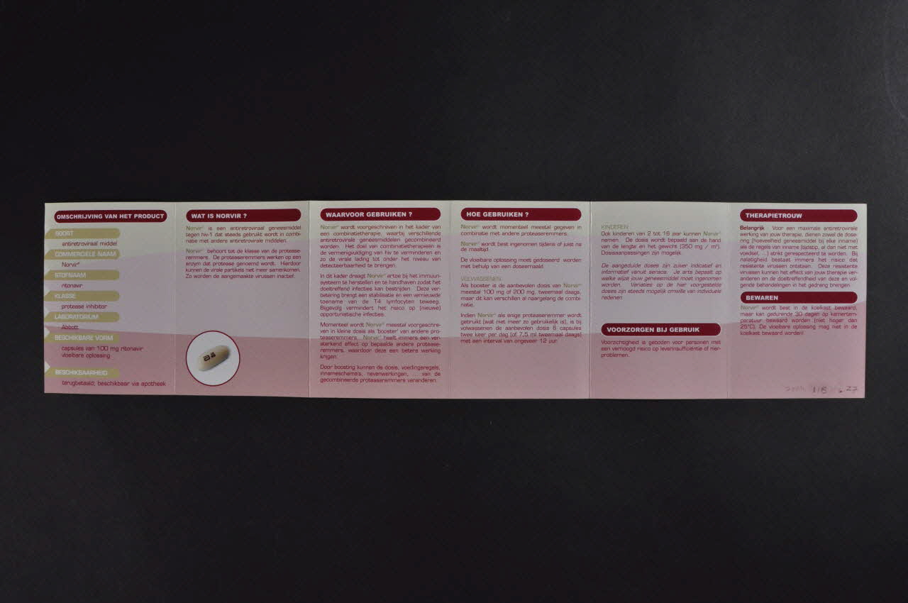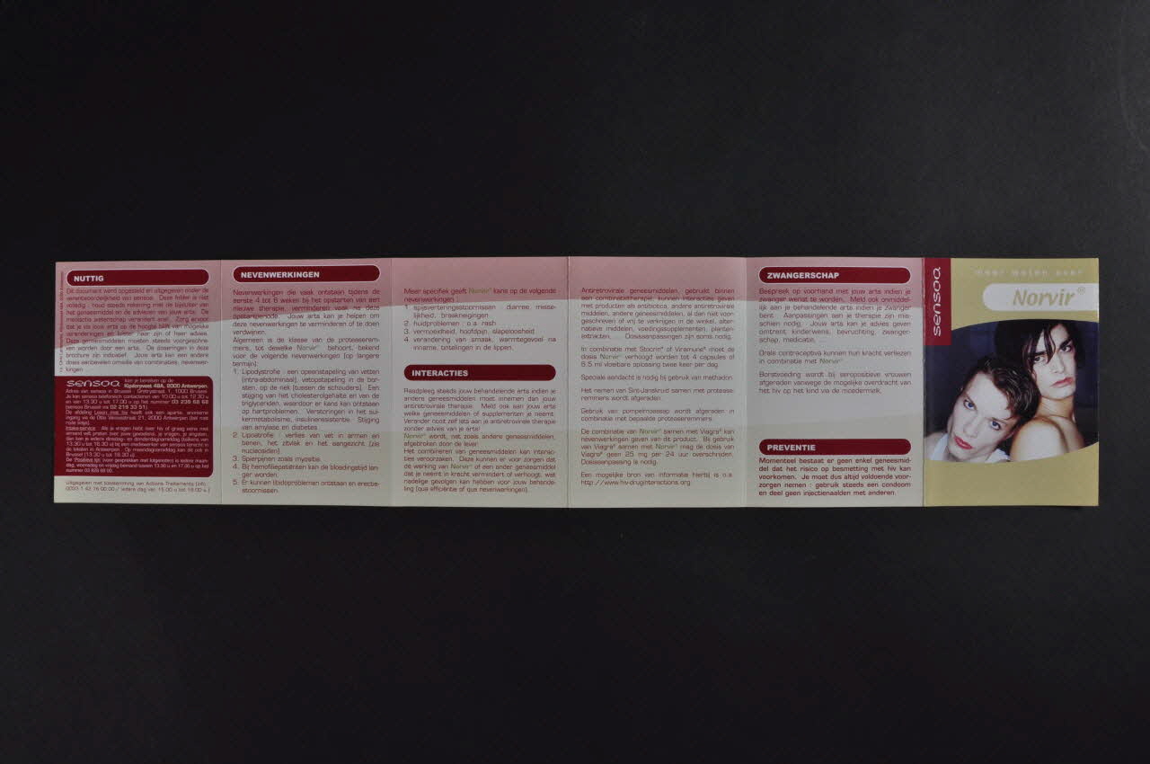 Meer weten over Norvir (En savoir plus sur Norvir) (Titre du dépliant en haut de la couverture.)OMSCHRIJVING VAN HET PRODUCT // WAT IS COMBIVIR ? // WAARVOOR GEBRUIKEN ? // HOE GEBRUIKEN ? // VOORZORGEN BIJ GEBRUIK // THERAPIETROUW // BEWAREN // NUTTIG // NEVENWERKINGEN // INTERACTIES // ZWANGERSCHAP // PREVENTIE (Titres des rubriques du dépliant.)sensoa (Nom de l'association écrit en blanc dans un cartouche bleu en haut à gauche de la couverture.)Décor