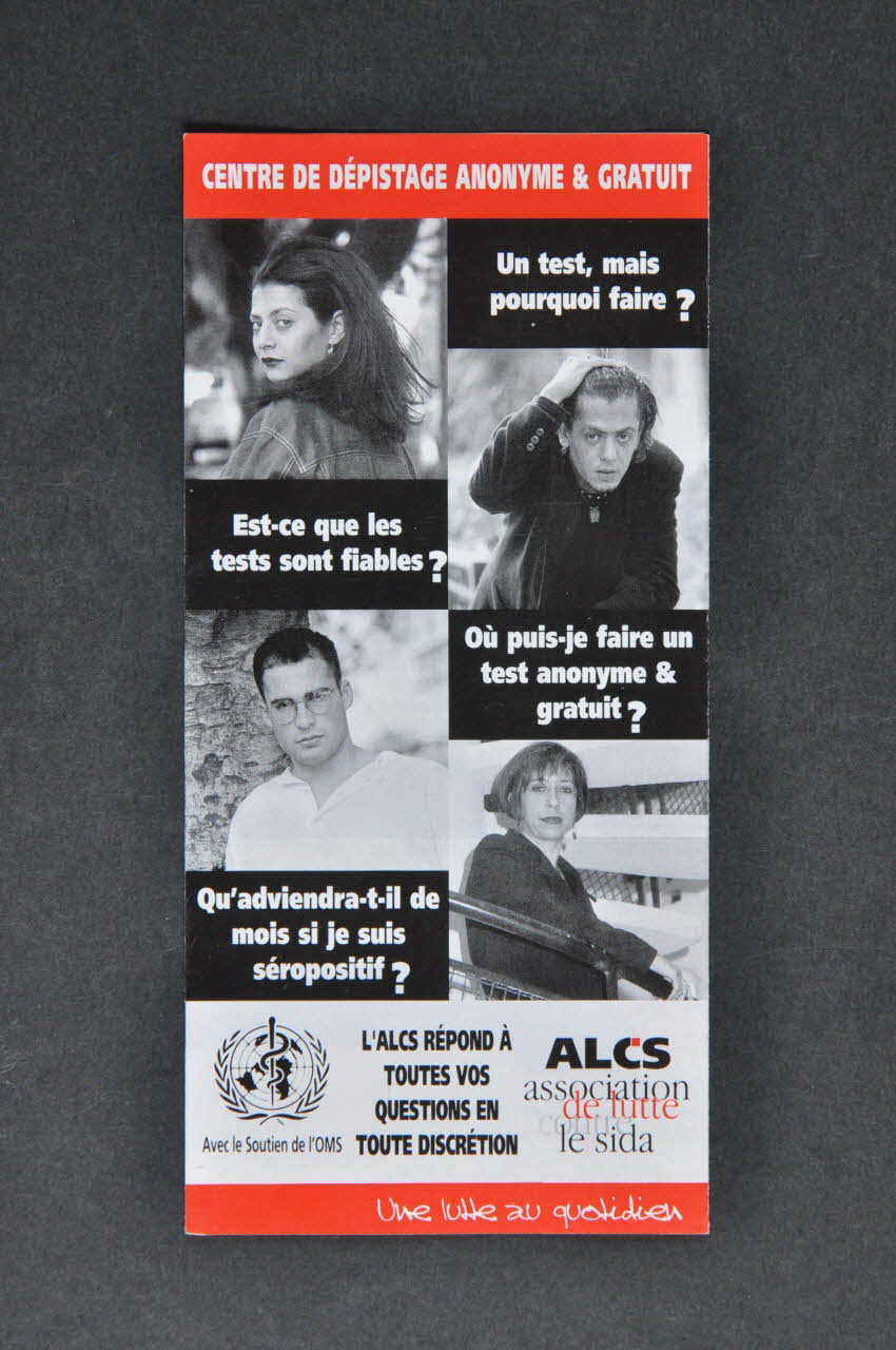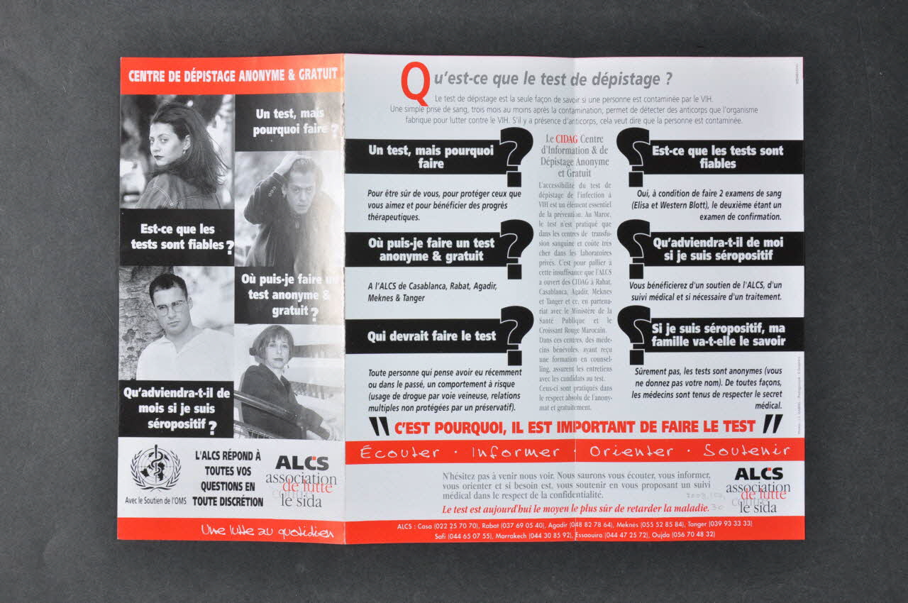 Au Maroc, le test n'est pratiqué que dans les centres de transfusion sanguine et coûte très cher dans les laboratoires privés. C'est pour pallier à cette insuffisance que l'ALCS a ouvert des CIDAG à Rabat, Casablanca, Agadir, Meknès et Tanger, et ce, en partenariat avec le Ministère de la Santé et le Croissant Rouge Marocain. Dans ces centres, des médecins bénévoles, ayant reçu une formation en counselling, assurent les entretiens avec les candidats au test. Ceux-ci sont pratiqués dans le respect absolu de l'anonymat et gratuitement. // // C'est pourquoi il est important de faire le test // // Ecouter. Informer. Orienter. Soutenir // // N'hésitez pas à venir nous voir. Nous saurons vous écouter, vous informer, vous orienter et si besoin est vous soutenir en vous proposant un suivi médical dans le respect de la confidentialité. // // Le test est aujourd'hui le moyen le plus sûr de retarder la maladie. (Sur les deux faces.)Logo, nom d'association