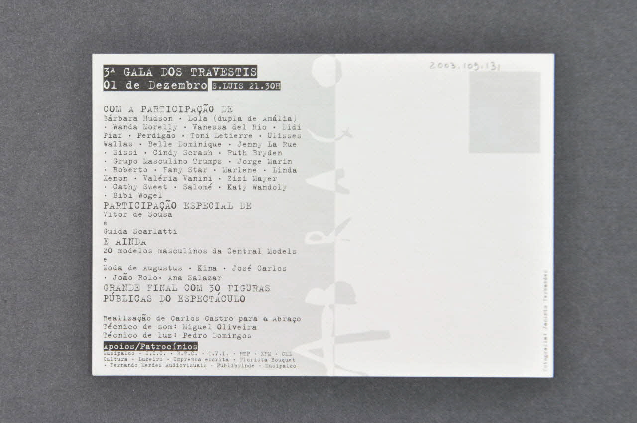 Fotografia : Jacinto Fernandes (En bas, à droite, le long du bord droit, petite inscription noire.), verso3a GALA DOS TRAVESTIS / 01 de Dezembro S. LUIS 21.30H / COM A PARTICIPAÇÃO DE / Barbara Hudson . Lola (dupla de Amalia) / . Wanda Morelly . Vanessa del Rio . Didi / Piaf . Perdigão . Toni Letierre . Ulisses / Wallas . Belle Dominique . Jenny La Rue / . Sissi . Cindy Scrash . Ruth Bryden / . Grupo Masculino Trumps . Joge Marin . Roberto . Fany Star . Marlene . Linda / Xenon . Valeria Vanini . Zizi Mayer . Cathy Sweet . Salomé . Katy Wandoly . Bibi Wogel / PARTICIPAÇAO ESPECIAL DE / Victor de Sousa / e / Guida Scarlatti / E AINDA / 20 modelos masculinos da Central Models / e / Moda de Augustus . Kina . José Carlos / . João Rolo . Ana Salazar / GRANDE FINAL COM 30 FIGURAS / PUBLICAS DO ESPECTACULO / Realização de Carlos Castro para a Abraço / Técnico de som : Miguel Oliveira / Tecnico de luz : Pedro DOmingos / Apoios/Patrocinios / Musipalco . S.I.C. . R.T.C. . T.V.I. . RTP . XFM . CLM / Cultura . Luzeiro . Imprensa escrita . Florista Bouquet . Fernando Wendes Audiovisuals . Publibrinde . Musipalco (Texte inscrit en noir, à gauche du dos de la carte, sur le fond gris.), versoDécor
