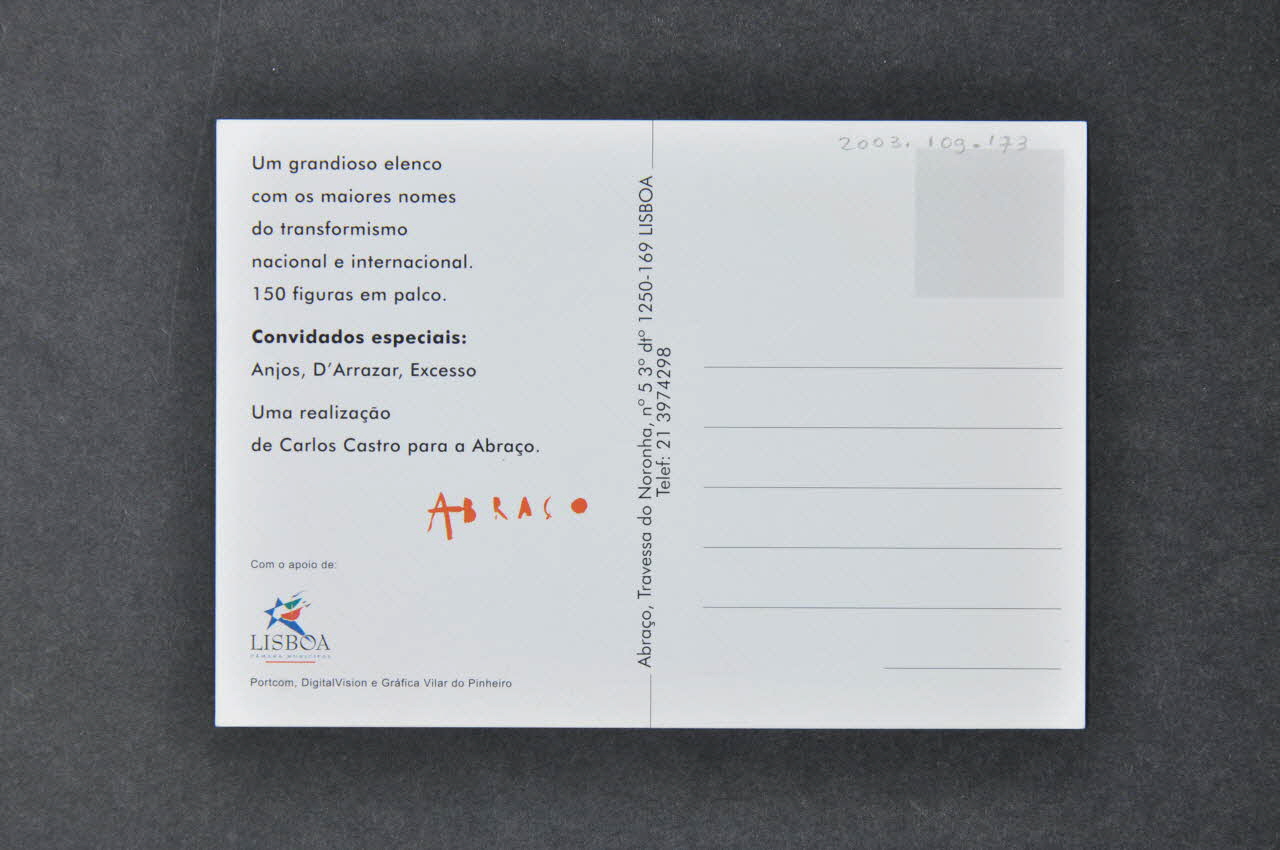 Um grandioso elenco // com os maiores nomes // do transformismo // nacional e internacional. // 150 figuras em palco. // Convidados especials : // Anjos, D'Arrazar, Excesso // Um realizaçao // de Carlos Castro para a Abraço. (Dans la colonne de gauche, en noir.), versoNom d'association, adresse