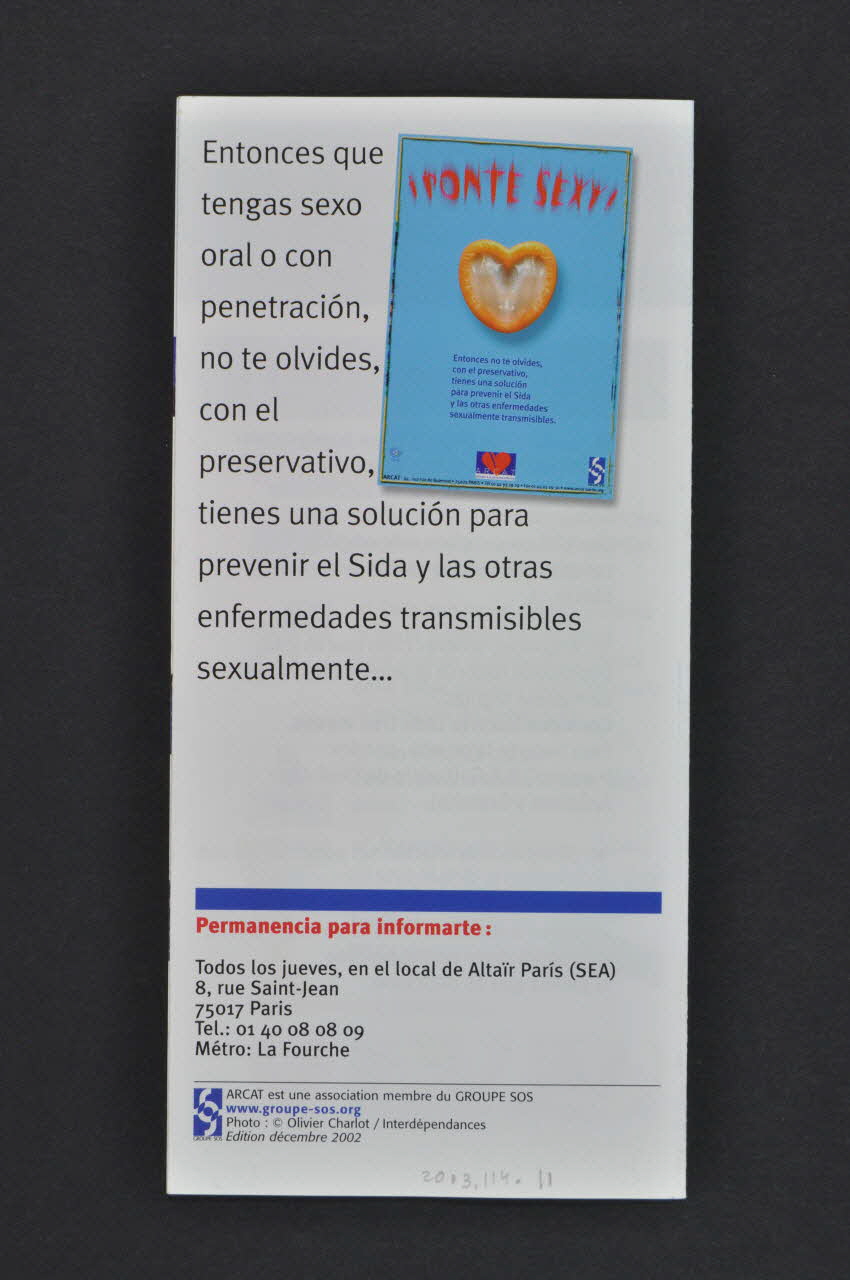 La partie supérieure de la couverture se compose d'un bandeau bleu avec un titre en grands caractères blancs. Au centre, une photographie couleur très sombre représente deux femmes sur un trottoir devant un panneau publicitaire la nuit. Un slogan est inscrit en sur-impression en blanc en bas de la photographie. La partie inférieure a un fond blanc, sur lequel il y a les coordonnées et le logo de l'association ARCAT: un coeur rouge déchiré sur un rectangle bleu. En dessous, il y a le logo d'un partenaire, la Cramif: des billes verte, bleue, violette, entourées de hachures bleues. Le verso a un fond blanc avec à droite un texte en caractères noirs et à gauche l'image d'une affiche avec un préservatif orange en forme de coeur. Dans la partie inférieure, on trouve les coordonnées d'une permanence et les informations concernant l'édition. A l'intérieur, les volets un à trois ont un bandeau bleu commun avec un texte en caractères blancs et oranges, précédé par un coeur rouge déchiré. Les textes ont des sous-titres composés de questions bleues en sur-impression sur une photographie retouchée bleutée en bandeau. Les parties des textes sont pointées par des petits coeurs rouges. Le volet deux a en sous-impression un point d'exclamation jaune. Le volet trois présente des vignettes dessinées répresentant l'utilisation des préservatifs masculin et féminin. Elles ont des sous-titres rouges. Le volet quatre a également un bandeau bleu avec des caractères blancs. Il est suivi par un texte en noir et rouge. La partie inférieure présente un texte en grands caractères noirs avec en sous-impression deux points d'exclamation jaunes.Inscriptions