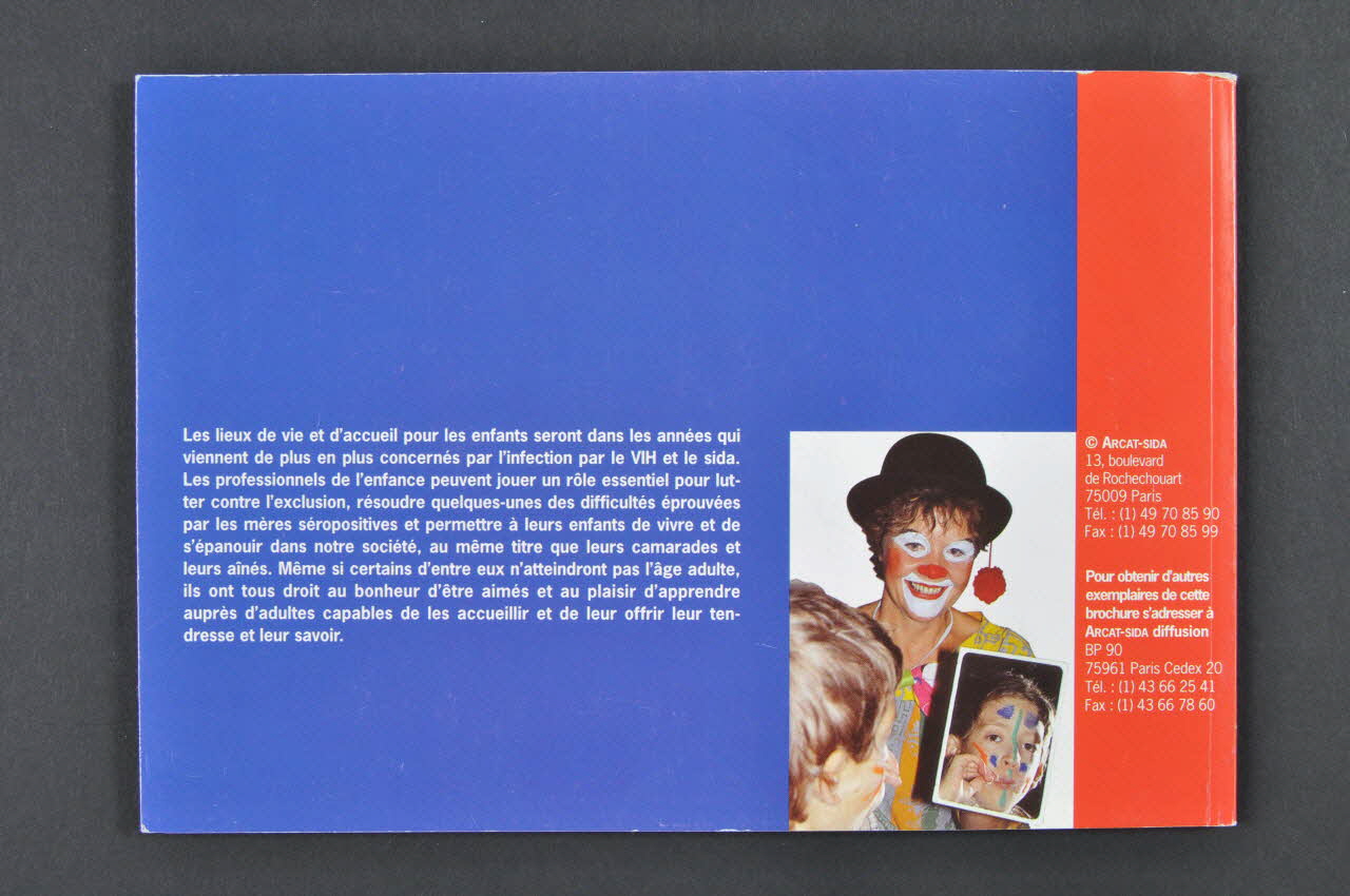 Elle est imprimée en couleur et est écrite en français. Elle est illustrée de nombreux dessins d'enfants. Le recto est divisé en trois parties inégales. Verticalement, à gauche, il y a un bandeau rouge de reliure sur lequel, en haut, se trouvent deux logos. En haut, en blanc, sur un fond bleu, est inscrit le titre. En bas, un dessin d"enfant est très coloré, rouge, rose, jaune, vert, noir, brun, blanc. On y distingue une tête avec des larmes et écrit en bas de la tête, une inscription. A l'intérieur, le fond est blanc et le texte est écrit en noir et en couleur, bleu, orange et vert. De nombreux dessins d'enfants l'accompagnent. Ils représentent des fleurs, soleils, animaux, coeurs, étoiles aplats colorés, sapin, personnages, maisons, thématique de Noël, robot, paysages. Le verso est partagé en deux. A droite, il y a un bandeau rouge de reliure sur lequel, en blanc, figurent des coordonnées. Le reste de la couverture est sur un fond bleu. A gauche, il y a un texte de présentation de la brochure en caractères blancs. A droite, se situe la photo d'un clown avec de dos un enfant maquillé qui se regarde dans une glace.Inscriptions