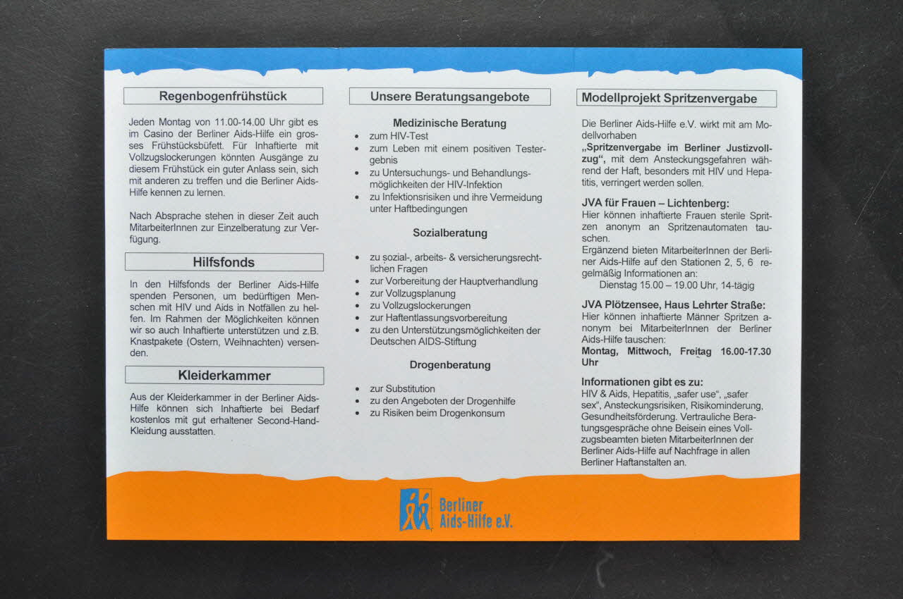 Berliner Aids-Hilfe e.V. // Meinekestr.12 // 10719 Berlin // Spendenkonto: 3132205 // Bank für Sozialwirtschaft . BLZ 100 205 00 (au dos de la brochure imprimé en bleu sur fond blanc, orange et bleu)Décor