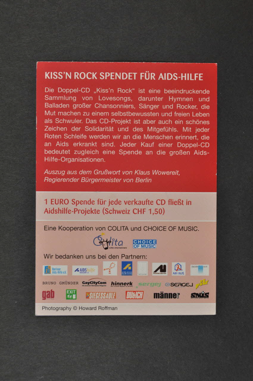 KISS'N ROCK SPENDET FÜR AIDS-HILFE // // Die Doppel-CD "Kiss'n Rock" ist eine beeindruckende // Sammlung von Lovesongs, darunter Hymnen und // Balladen grosser Chansonniers, Sänger und Rocker, die Mut machen zu einem selbstbewussten und freien Leben // als Schwuler. [...] (Imprimé en blanc dans la moitié supérieure), versoDécor