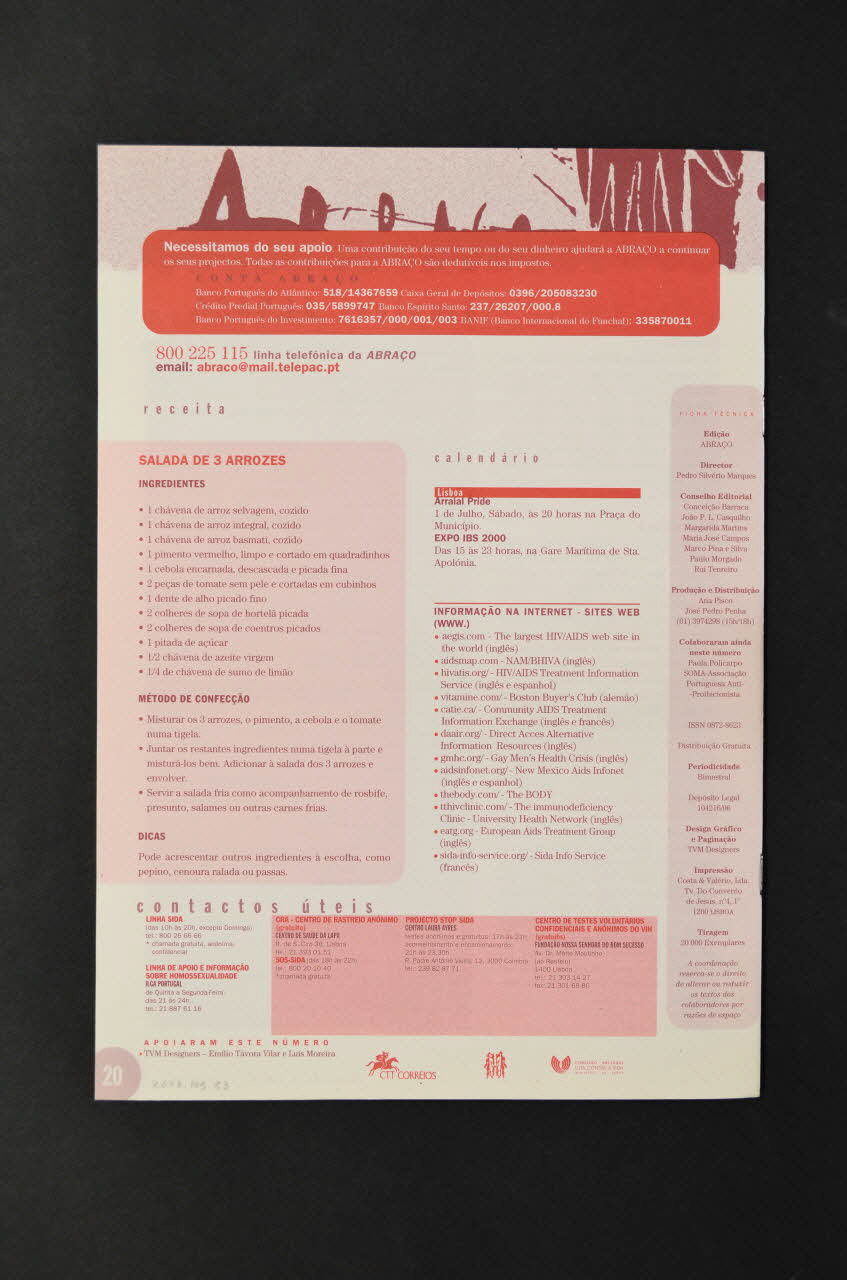 Editorial // Noticias // Disfunção sexual // Sexo oral : use a cabeça // Preservativos desestabilizadores // Salas de chuto // Vale Tudo // Accesso aos tratamentos // Declaração da SOMA // Entrevista // Sobre o proteto dos delegados (...) // Dois testemunhos de um recluso // Mensagens // Linha telefonica ABRACO // Glossario // Servicios ABRACO // Receita // Calendario, sur la couvertureNuméro, date