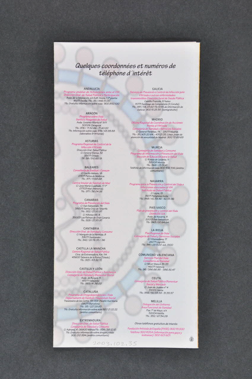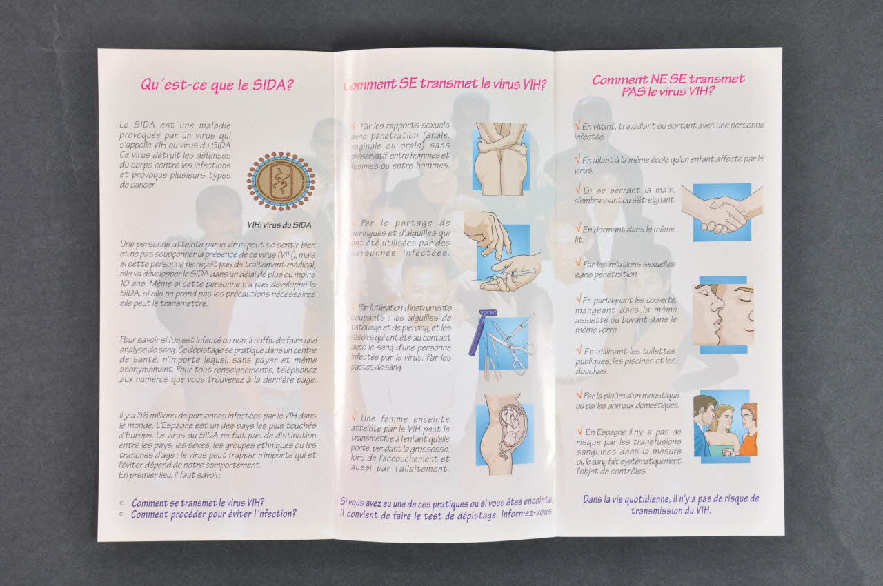 Feuillet 1 : Qu'est-ce que le sida ? Le sida peut frapper n'importe qui... Vignette dessin bleu, gris, violet représentant schématiquement le virus. Feuillet 2 : Comment se transmet le virus VIH ? Rapports sexuels avec pénétration (anale, vaginale ou orale) sans préservatifs / partage de seringues et d'aiguilles / utilisation d'instruments coupants (aiguilles de tatouage ou piercing, rasoirs, pactes de sang / grossesse, accouchement, allaitement. (4 vignettes couleur illustratives) Feuillet 3 : Comment ne se transmet pas le virus VIH ? vie quotidienne, école, serrer main, embrasser (vignette) (vignette), dormir dans le même lit, relations sexuelles sans pénétration, partage couverts, verres (vignettes), toilettes publiques, piqûre de moustiques, transfusions sanguines (en Espagne) Feuillets 4 et 5 En sous impression, en grand, la représentation du virus du feuillet 1 Feuillet 4 : Quoi faire pour ne pas s'infecter ? Préservatif / Ne pas utiliser des seringues ou aiguilles ayant déjà servi / Ne pas partager des instruments coupants. Pourquoi faire le test de dépistage est une bonne chose ? Prendre les médicaments de façon précoce / précautions pour femme enceinte / prévention. (En italiques violettes) :"Et rappelez-vous que le respect et la solidarité contribuent à prévenir le Sida" Feuillet 5 (dos). Adresses utiles en Espagne (Institutions des régions, Association FASE, Téléphone 900 Rosa (Gays et lesbiennes)