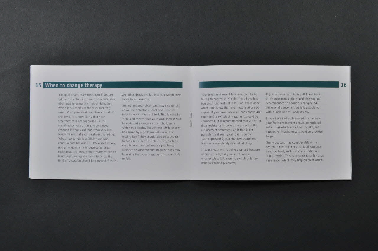 information series for hiv-positive people (inscription en gris sur fond vert clair dans la bande verticale en haut de la couverture, au-dessus du titre), sur la couvertureDécor