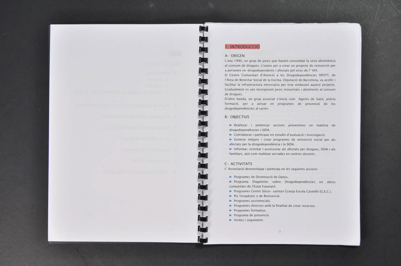Cette brochure, en catalan, au format rectangulaire, se compose de vingt-deux pages numérotées sur du papier blanc, reliées par des anneaux en plastique noir dans une couverture en matière plastique - une feuille transparente au recto, une feuille opaque noire au verso.