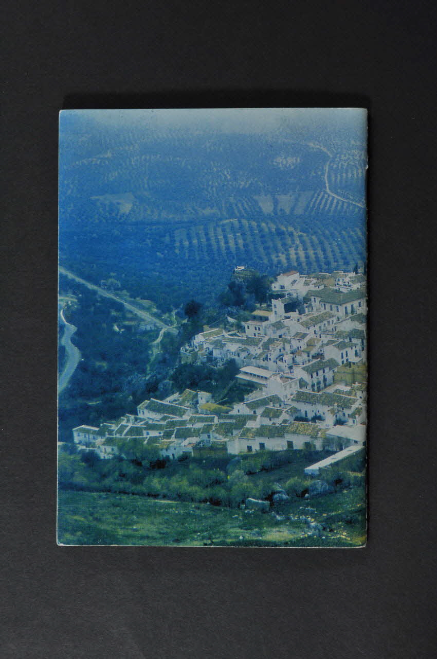 Celle-ci représente une photographie pleine page d'un village en Espagne avec des collines dans le fond. Dans le haut se trouve le titre, imprimé en gris et blanc dans un encadré bleu. En bas, un logo est imprimé. Cette photographie se poursuit à l'arrière. L'intérieur présente plusieurs régions de l'Espagne. Certains fonds sont constitués d'une photographie en filigrane. D'autres photographies noir et blanc sont disposées en vignettes pour illustrer le texte. La troisième page de couverture comporte une carte géographique de l'Espagne avec ses différentes provinces.Inscriptions