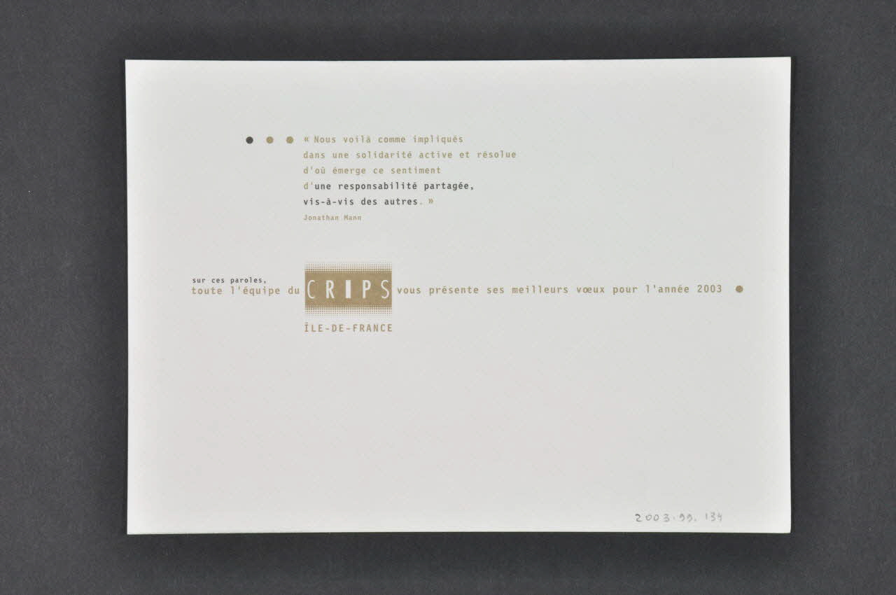 sur ces paroles, // toute l'équipe du CRIPS vous présente ses meilleurs voeux pour l'année 2003 // ILE-DE-FRANCE (Au centre, en caractères dorés et noirs, sur fond blanc), verso"Nous voilà comme impliqués // dans une solidarité active et résolue // d'où émerge ce sentiment // d'une responsabilité partagée, // vis-à-vis des autres." // Jonathan Man (Dans la partie supérieure, en caractères dorés et noirs, sur fond blanc), versoDécor