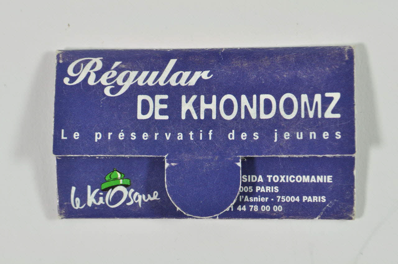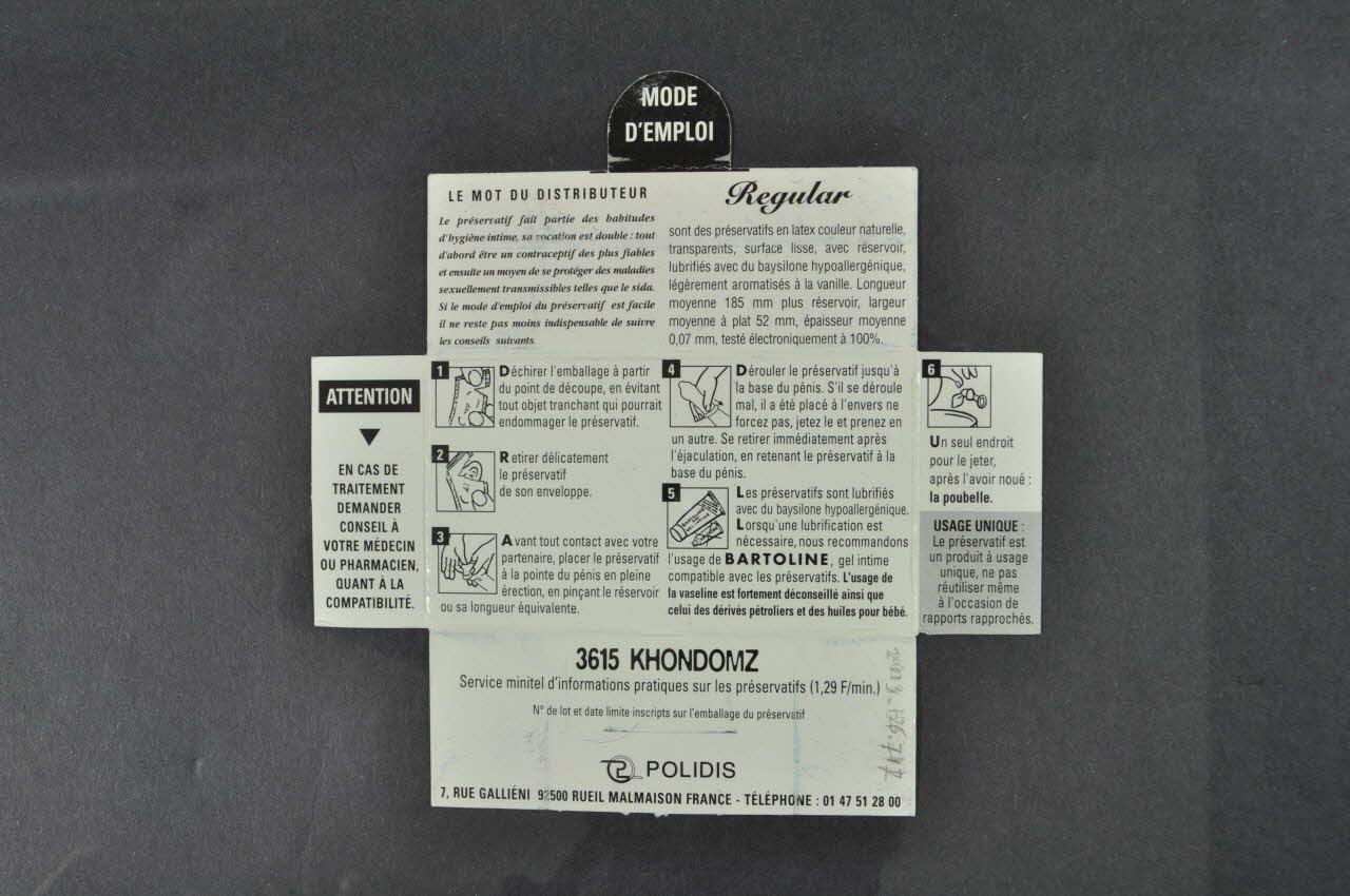 L'étui, destiné à contenir un préservatif emballé, est aujourd'hui vide. Il est en carton découpé et plié, de manière à constituer une pochette à quatre rabats, se fermant au revers en inserrant l'onglet du rabat supérieur dans l'encoche du rabat inférieur. La face extérieure du carton est teinte en bleu. Au recto, un carré orange aux angles arrondis et une bande jaune inscrite au-dessus, indiquent le titre et les dates d'une campagne organisée autour du préservatif. Dessous, un préservatif dessiné donne la marque du produit, près de l'adresse du distributeur indiquée en lettres blanches. Au verso, la marque est reprise en caractères blancs, ainsi que les coordonnées d'un centre de dépistage et d'information. A l'intérieur, se trouve le mode d'emploi, inscrit en lettres noires sur fond blanc, avec les caractéristiques typologiques du préservtaif, et quatre vignettes légendées illustrant son mode d'utilisation.Inscriptions