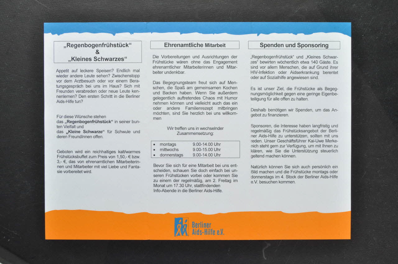 Berliner Aids-Hilfe e.V. // Meinekestr.12 // 10719 Berlin // Spendenkonto: 3132205 // Bank für Sozialwirtschaft . BLZ 100 205 00 (au dos de la brochure imprimé en bleu sur fond blanc, orange et bleu)Décor